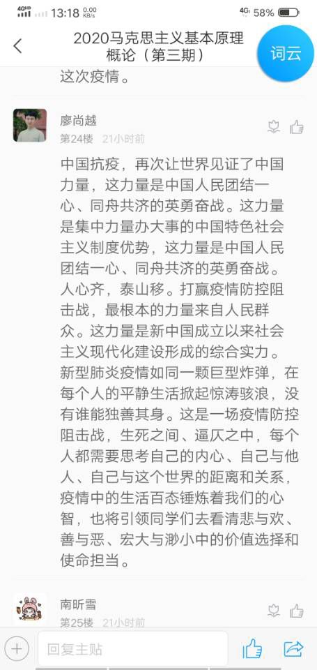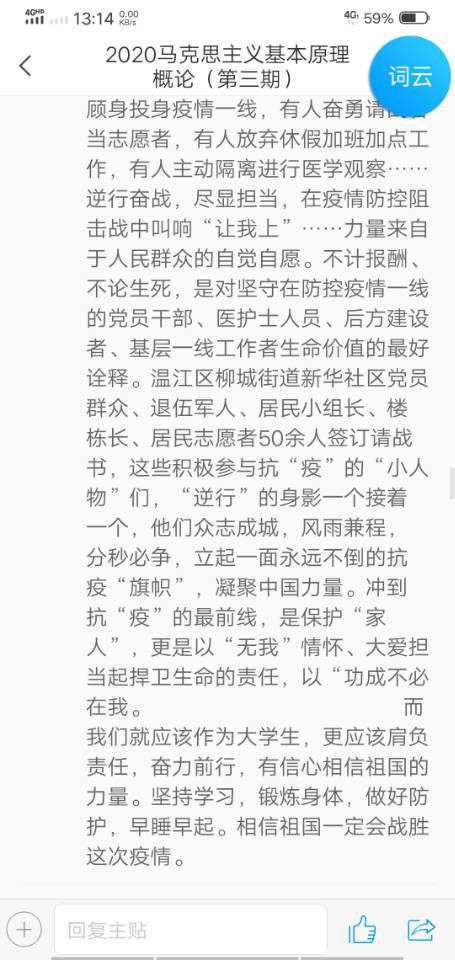 学习结束后,原理教研室教师通过学习通平台围绕如何理解“中国力量”、在打赢这场疫情防控人民战争、总体战、阻击战中青年学子有何责任担当,引导学生开展讨论,全校2700多名学生积极参与了线上讨论。