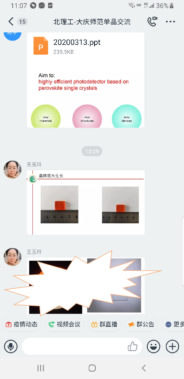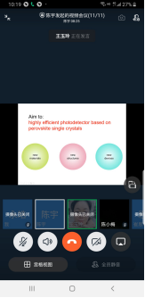 2020年3月13日上午10时,庆师-北理课题组通过钉钉平台召开了科研工作阶段会议。参会人员有我院刘永皓教授、王玉玲老师、任艳东老师及北理科研团队共计11人,会议由北京理工大学陈宇老师主持。会议初,钟海政教授先简介了本次会议目的和内容,并阐明团队今后的工作重点。会议共有三个科研报告,首先北理陈宇老师介绍了在北理方面在钙钛矿单晶光电探测器方面的研究进展。我院王玉玲老师汇报了庆师方面在钙钛矿超大晶体可控生长发面的研究进展。随后,任艳东老师作为题为异质结钙钛矿单晶光电探测器研究的工作报告。每个报告结束后,与会人员都会对相关科研工作进行详细研讨,指出存在的问题并且制定下一步优化方案。会后,制定了近期工作目标及下次报告主题。