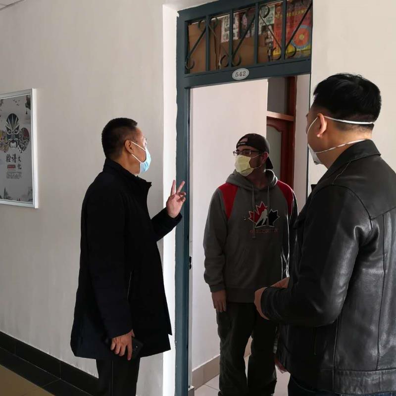 在检查了留学生公寓的厨房、房间和走廊的卫生及消毒情况后,郭崇林副校长询问了留学生线上学习的进展和效果,要求留学生不仅要认真努力学习,还要保持室内通风,注意个人卫生,加强身体锻炼,做好自我防疫。在了解到留学生每周二和周六可以在校园内自由活动时,他叮嘱留学生们一定要注意安全,带上口罩防护好,多穿些衣物防寒保暖。