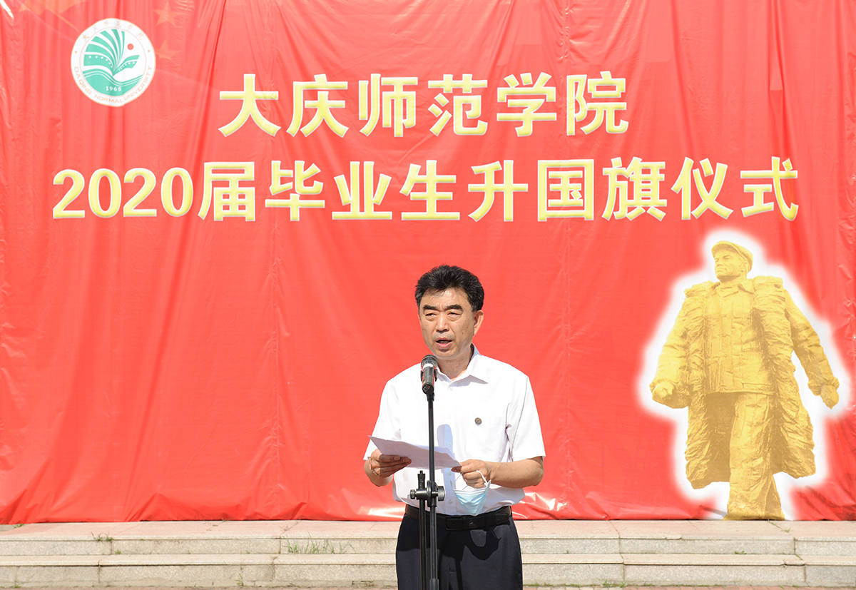 副校长刘恒在仪式上作了热情洋溢的讲话。突如其来的新冠疫情使大部分同学不能亲临现场,但母校依然记得同学们可爱的模样。作为2020届毕业生在母校的最后一次升旗仪式,他希望毕业生要增强爱党爱国意识、坚定共产主义信仰、树立人生远大目标,在未来的筑梦路上,始终铭记:老实做人、勤奋做事、勇于担当、乐于奉献,争做具有铁人精神特质的社会主义建设者和接班人。