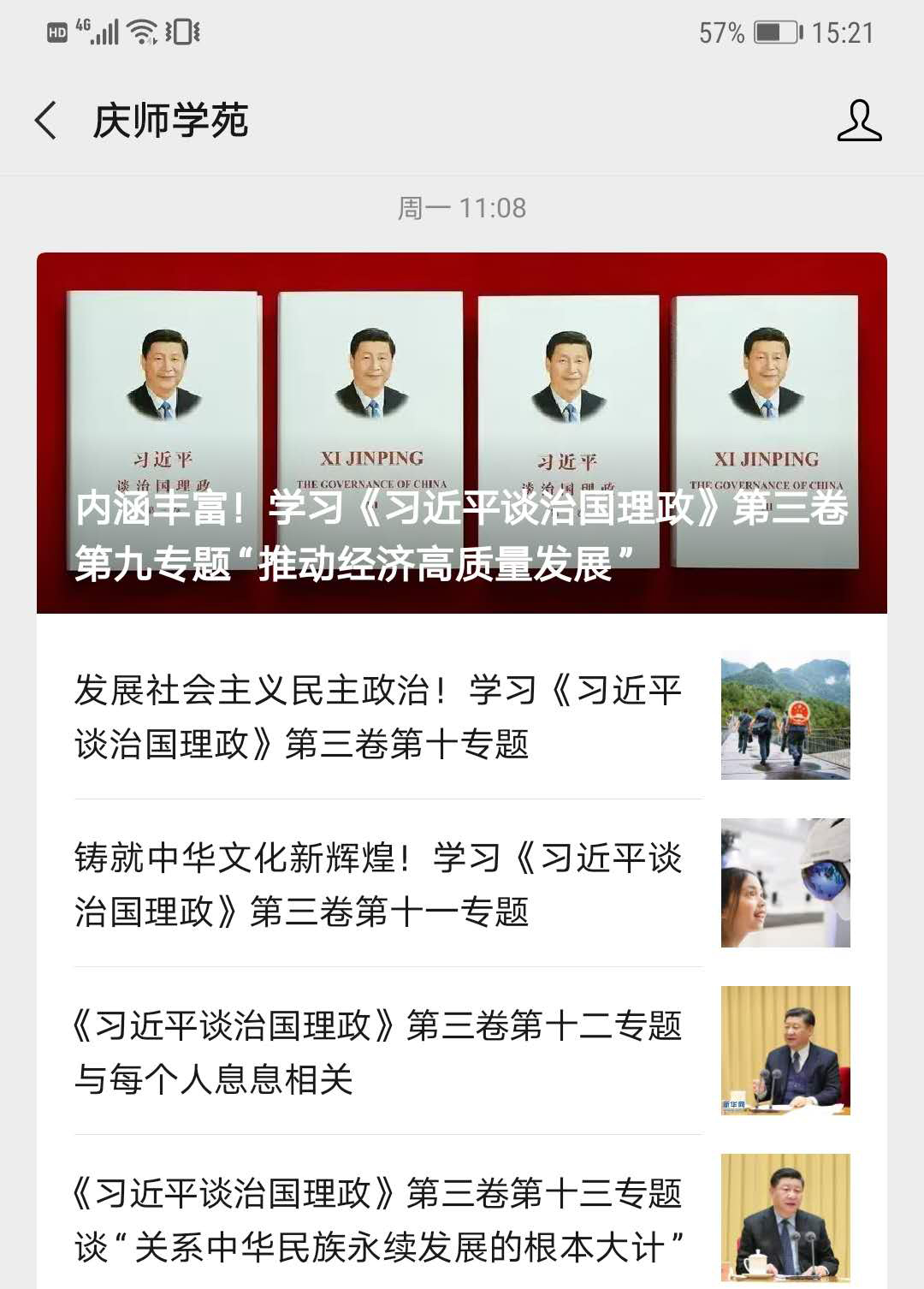 创新学习形式,营造良好氛围。学校建立了“庆师学苑”微信公众平台,设置了“学”“思”“用”三个专栏,系统学习《习近平谈治国理政》第三卷的19个专题92篇文章,及时跟进学习习近平新时代中国特色社会主义思想,开展线上微热议、云研讨等活动,进一步增强学习针对性、实效性。同时利用“学习强国”学习平台、极光新闻、365英国上市官网网站主页等跟进学习,其中极光新闻学习参与率100%,始终处于全省高校前列,营造出活动开展良好氛围,创新推动党的科学理论进校园。
