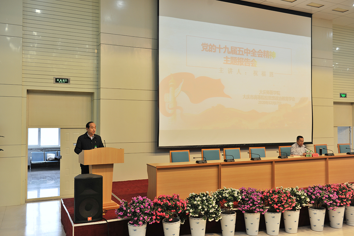 学习好、宣传好、贯彻好党的十九届五中全会精神,是当前和今后一个时期全党的首要政治任务。2020年12月17日下午,学校党委举办学习贯彻党的十九届五中全会精神培训班开班式暨第一场专题辅导。邀请了哈尔滨工程大学马克思主义学院教授、博士生导师祝福恩教授做《党的十九届五中全会及〈建议〉意义背景、当代价值》专题辅导讲座,全面解读党的十九届五中全会精神。学校领导班子成员、科级以上干部、“青马工程”大学生骨干参加了培训。开班式由党委副书记王革主持。