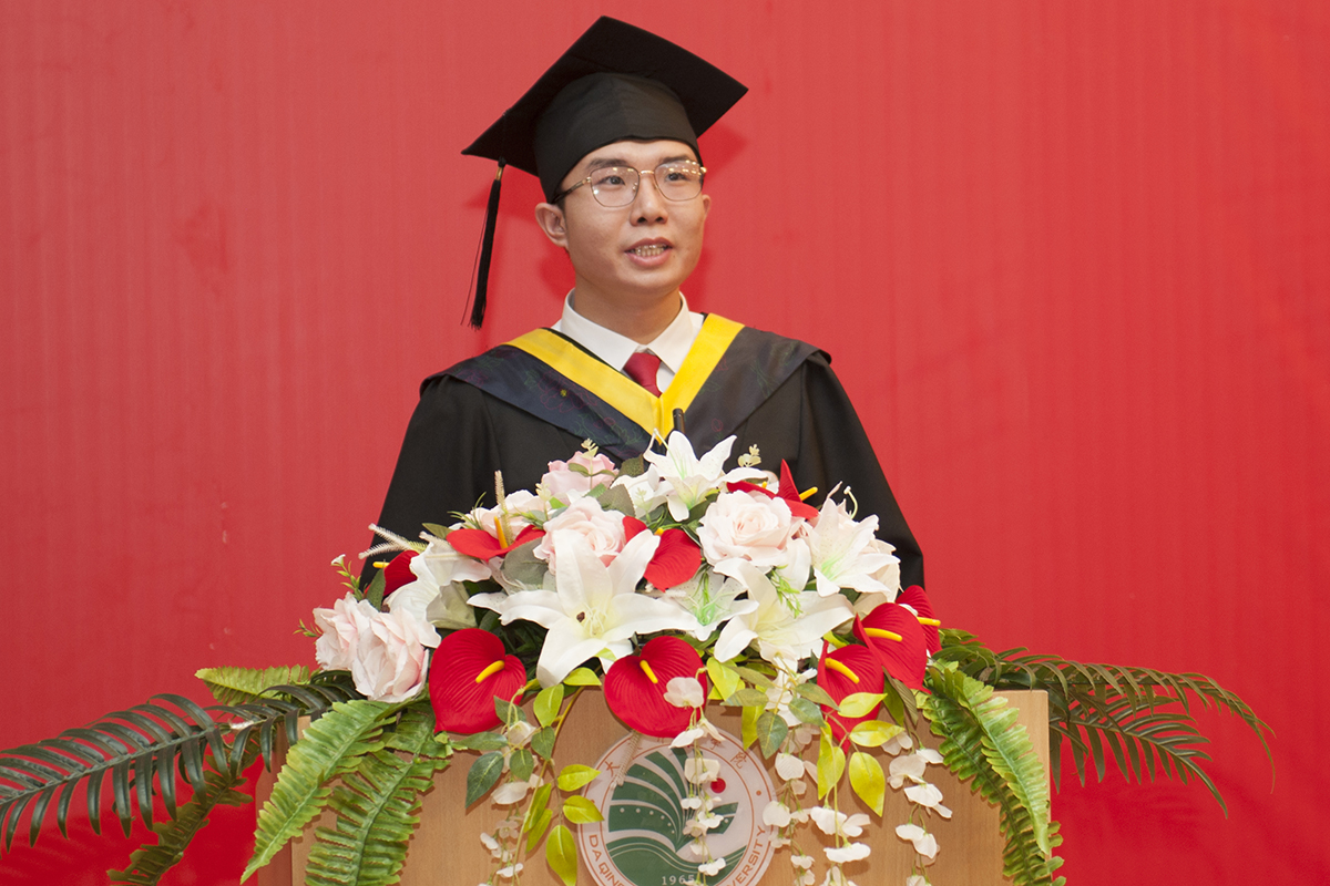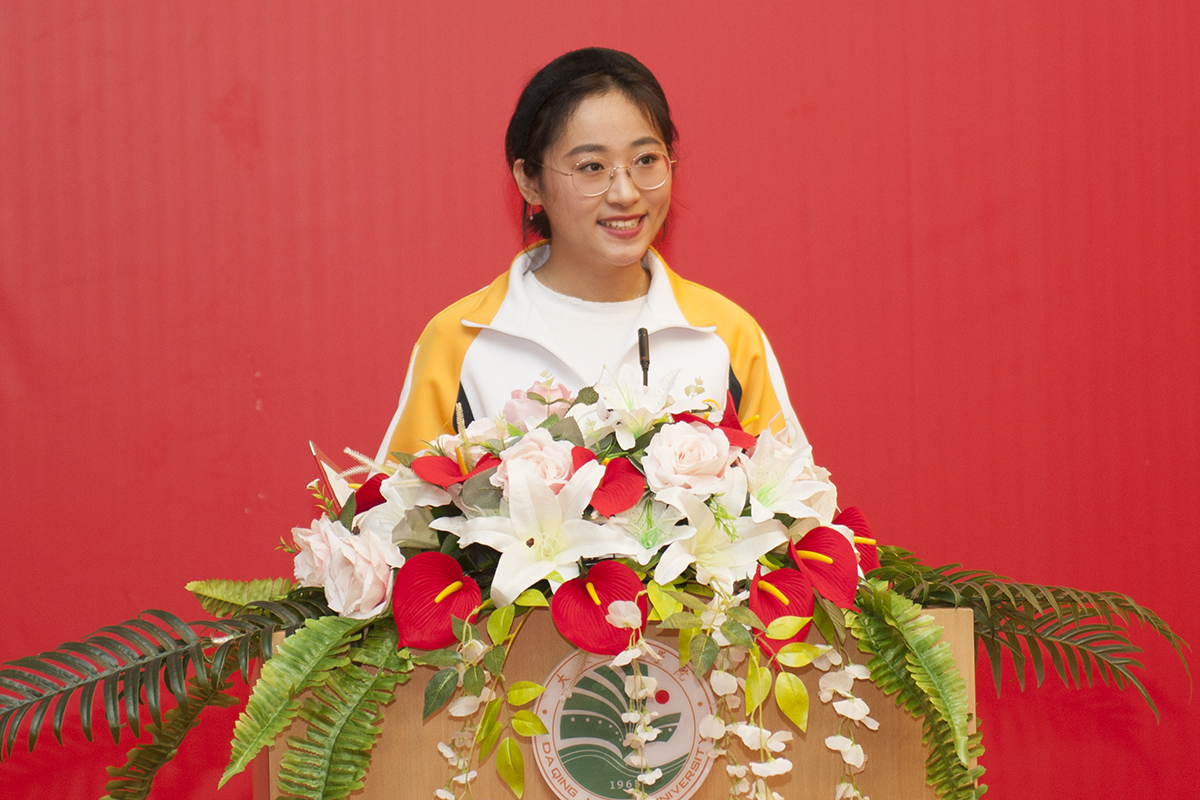毕业生代表付英东同学发言。他深情回顾了在校四年来的收获与成长,他表示,无论何时何地,庆师毕业生将秉持“爱国、创业、求实、奉献”的大庆精神铁人精神砥砺前行,不会辜负母校的期望,向全社会展现庆师人的使命担当。