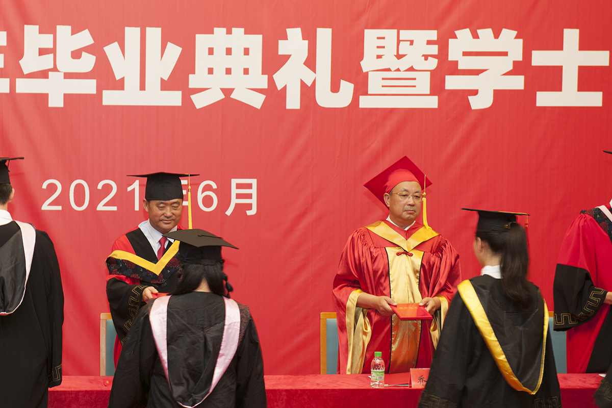 副校长郭崇林教授宣读《365英国上市官网2021届毕业生取得毕业资格和获得学士学位学生名单》;党委副书记王革宣读《365英国上市官网获得优秀毕业生、铁人式优秀毕业生表彰通报》后,学校领导分别为获奖学生代表颁发证书。
