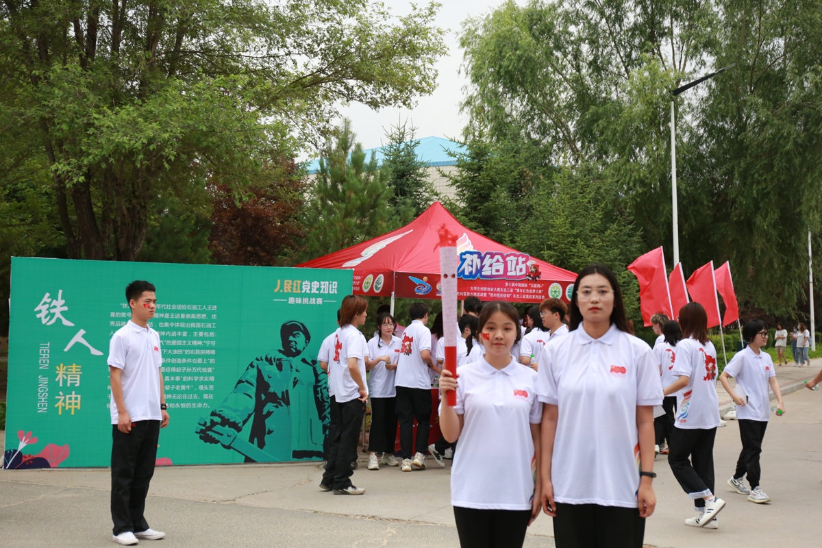 活动现场气氛热烈,师生们手持答题卡,途经我校举办2019年“青年红色筑梦之旅”全国对接活动时的场地、“铁人”王进喜塑像、校训景观石和建党百年标志等建筑。