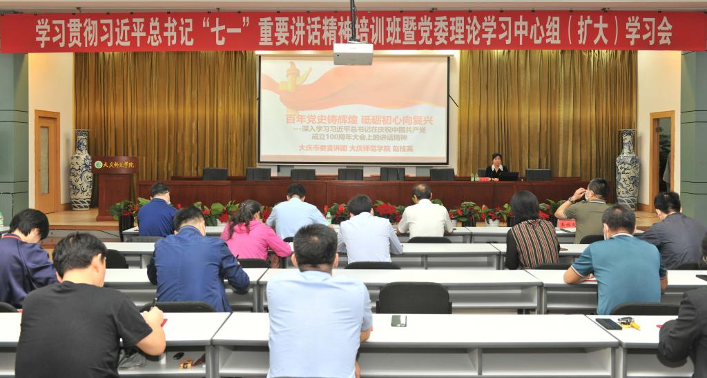 9月3日上午,我校学习贯彻习近平总书记“七一”重要讲话精神培训班暨党委理论学习中心组(扩大)学习会在铁人讲堂召开,市委宣讲团成员、马克思主义学院党总支书记赵桂英作《百年党史铸辉煌,砥砺初心向复兴——深入学习习近平总书记在庆祝中国共产党成立100周年大会上的讲话精神》宣讲报告,会议由党委副书记王革同志主持,学校领导班子成员、副处级以上领导干部参加会议。