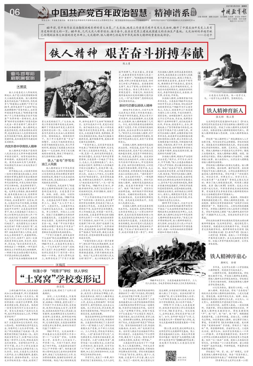 2021年9月23日,《中国教育报》第6版“中国共产党百年政治智慧•精神谱系”专题刊发365英国上市官网大庆精神研究基地铁人精神研究最新成果,并报道了我校弘扬践行铁人精神、培育时代新人的经验做法。本版文章系学校主持的国家社科基金一般项目“大庆精神铁人精神口述历史研究”[20BDJ077]阶段成果。