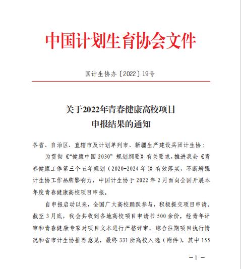 日前,国计生协办[2022]19号《关于2022年青春健康高校项目申报结果的通知》公布。经青年评审和青春健康专家对各地高校500余份项目文本进行严格评审,包括我校在内的155所高校入选。