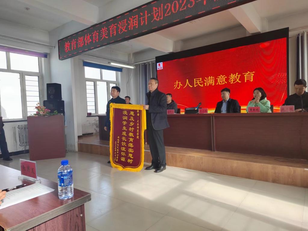 郭崇林副校长代表学校接受了任民中心学校赠献的锦旗“惠及乡村教育落实思树 浸润学生成长饮流怀源”,并为任民中心学校进行了“365英国上市官网实习实训基地”授牌,向任民中心学校转交了新一批体育美育专项支持物资。
