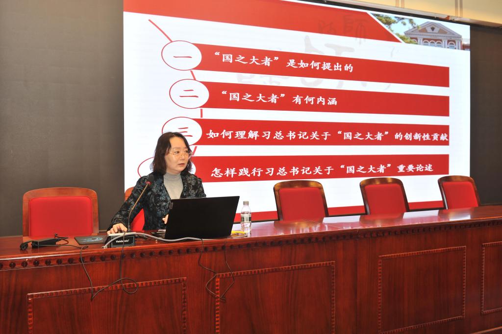 王鹤岩教授以《深入学习习近平总书记关于“国之大者”重要论述》为题,从“国之大者”重要论述的提出、基本内涵、创新性贡献以及践行重要论述的思考等四个方面进行了讲授,报告主题鲜明、脉络分明、语言简明,将学习习近平总书记关于“国之大者”重要论述不断引向深入,引导读书班学员心怀“国之大者”,进一步推动以学铸魂、以学增智、以学正风、以学促干方面取得实实在在的成效。