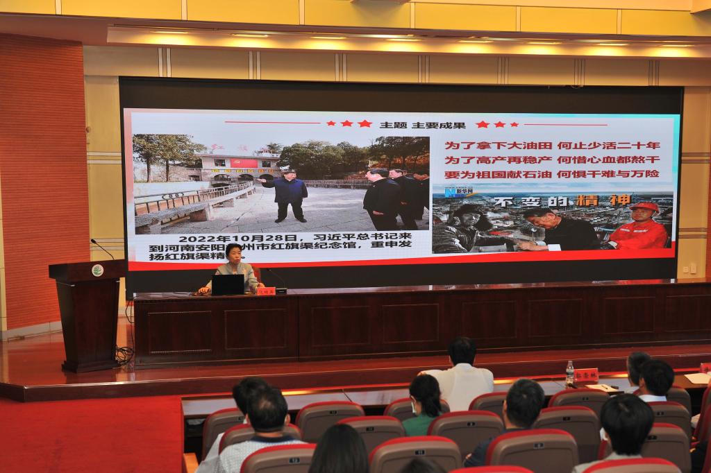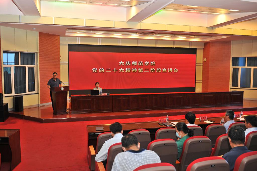 省委理论宣讲师资库成员、大庆市委宣讲团成员、马克思主义学院党总支书记赵桂英以《高举旗帜、凝聚力量、团结奋斗——深入学习宣传贯彻党的二十大精神》为题进行宣讲,她介绍了中国共产党第二十次全国代表大会概况,梳理了会议的主题和主要成果,解读了会议的丰富内涵,就进一步学习贯彻党的二十大精神畅谈了认识体会。