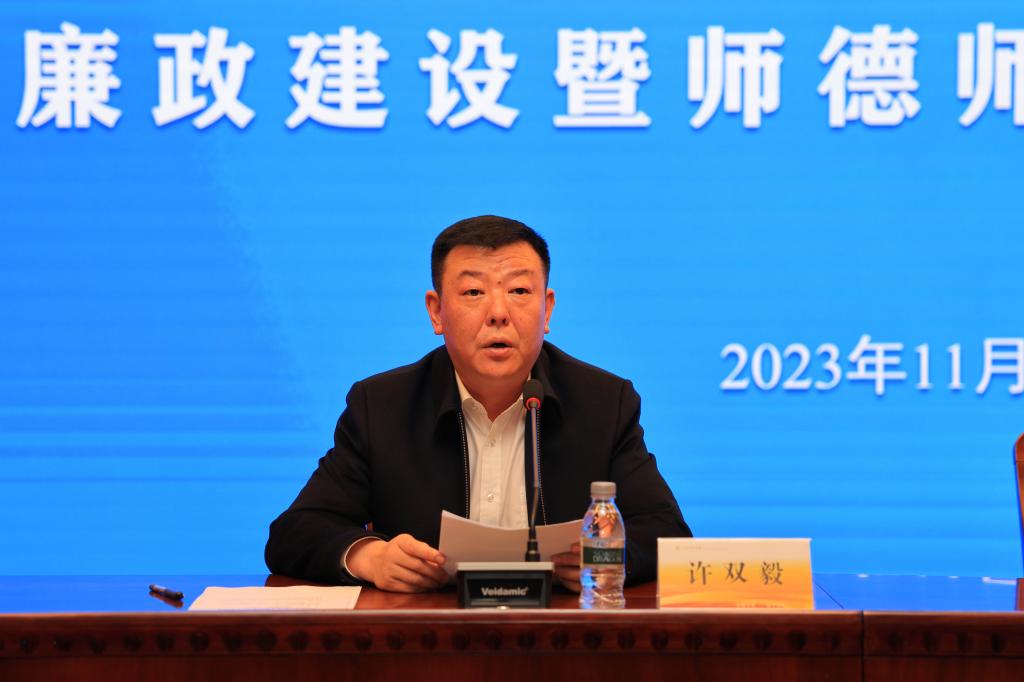 党委副书记徐晓东对加强党风廉政建设和师德师风建设提出了具体要求,他强调认识上要有高度。广大教师要大力弘扬教育家精神,强化使命担当,牢记为党育人、为国育才的责任与使命,做庆师“四有”好老师,做庆师的“大先生”,努力做“经师”和“人师”的统一者。学识上要有厚度。好老师不能满足于装满自己的“一桶水”,而要使自己时时有“活水”,做到博学多才,与时俱进,不断汲取新知识,更新自己的知识结构,积极回应新的挑战。育人上要有温度。教师必须以德立身、以德立学、以德施教,要有言为士则、行为世范的自觉,时时处处做学生的示范和榜样,帮助学生自我教育、自我完善,努力成为学生的好朋友和知心人。执纪上要有力度。相关部门要严守师德底线,以典型案例为指导,及时发现苗头性、倾向性问题,抓早抓小,防微杜渐,教育引导广大教师以案为鉴、引以为戒,共同维护风清气正的育人环境。