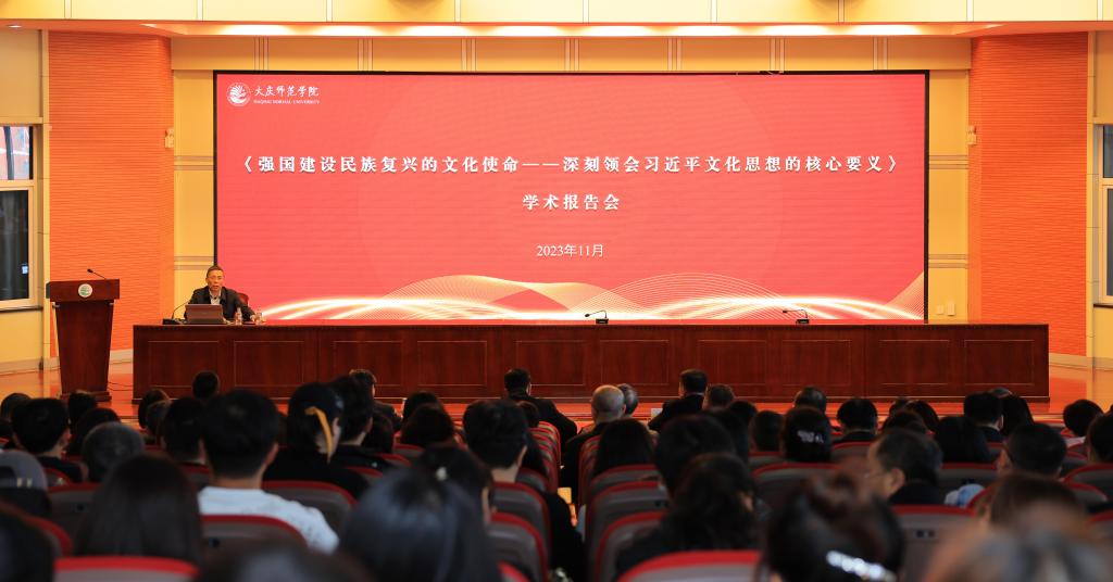 王永贵教授以《强国建设民族复兴的文化使命——深刻领会习近平文化思想的核心要义》为题,结合习近平总书记“七个着力”的具体要求,阐释了习近平文化思想的生成逻辑、核心要义和历史贡献。他指出,习近平文化思想突出了文化工作的重要作用,鲜明提出了新时代的文化使命,深刻阐释了中国特色社会主义文化发展道路,全面概括了宣传思想文化工作的部署要求。他强调,习近平文化思想指引文化强国建设创造新辉煌,深化了文化建设规律新认识,确立了中华文明复兴新指南,标明历史自信、文化自信新高度,彰显了人类文明进步新气象。