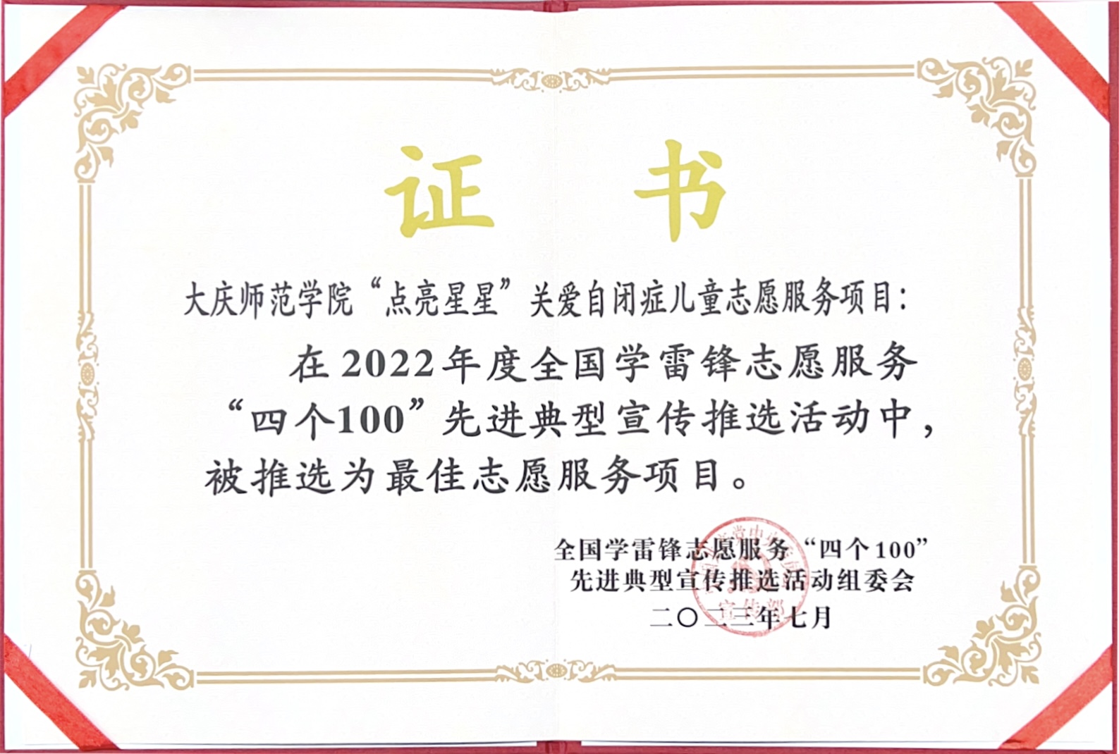 为深入学习宣传贯彻习近平新时代中国特色社会主义思想和党的二十大精神,培育和践行社会主义核心价值观,大力弘扬“奉献、友爱、互助、进步”的志愿精神,更好发挥志愿服务的积极作用。12月5日,黑龙江省委宣传部在哈尔滨举行首届“龙江最美志愿者(群体)”发布仪式,我校“点亮星星”关爱自闭症儿童志愿服务项目在2022年度全国学雷锋志愿服务“四个100”先进典型宣传推选活动中,被推选为最佳志愿服务项目。校团委张芮荧老师作为获奖代表参加此次发布仪式。