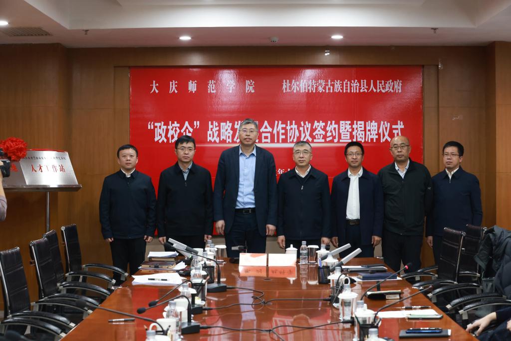 杜尔伯特蒙古族自治县委书记张剑与365英国上市官网党委书记赵科学代表县校双方就“人才工作站”暨“实习—实训—就业一体化基地”、“优秀人才培训基地”暨“继续教育学院联合共建培训基地”进行揭牌。