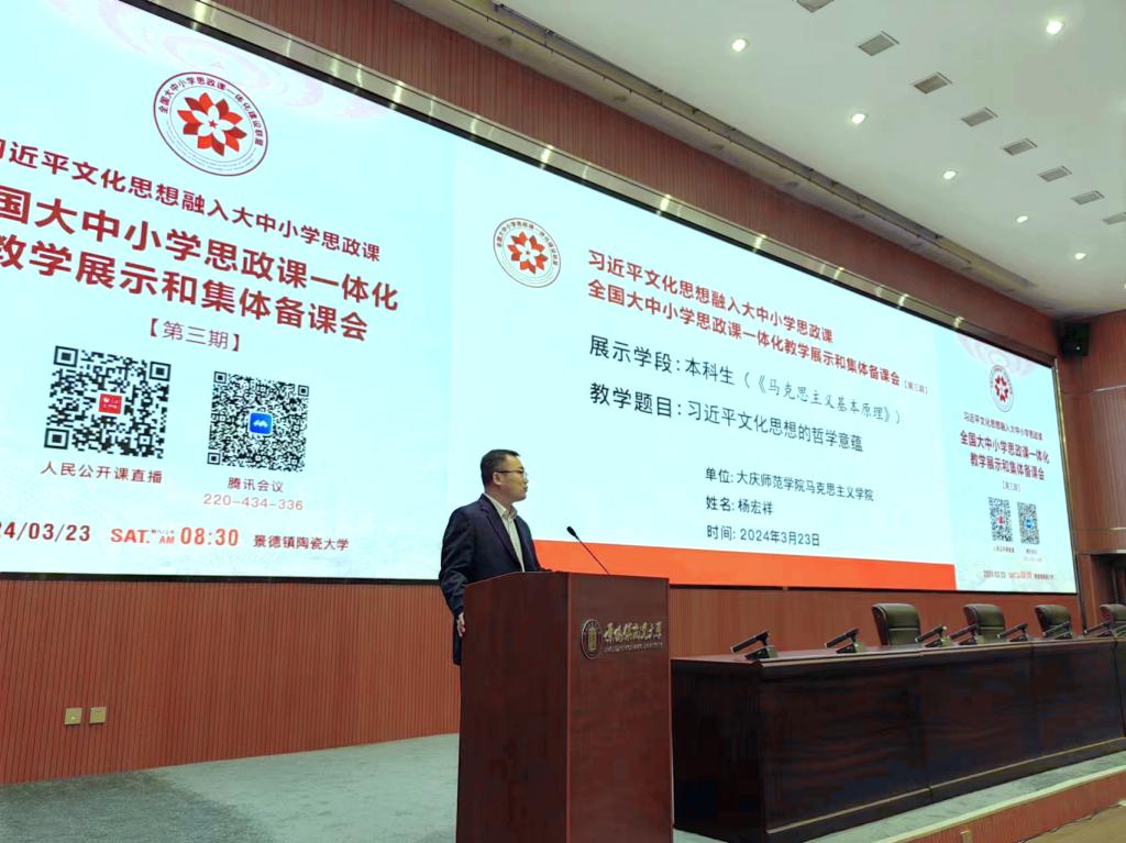 2024年3月23日上午,全国大中小学思政课一体化教学展示和集体备课会(第三期)在景德镇陶瓷大学湘湖校区国际学术报告厅以线上与线下相结合的方式举行。会议的主题为习近平文化思想融入大中小学思政课。