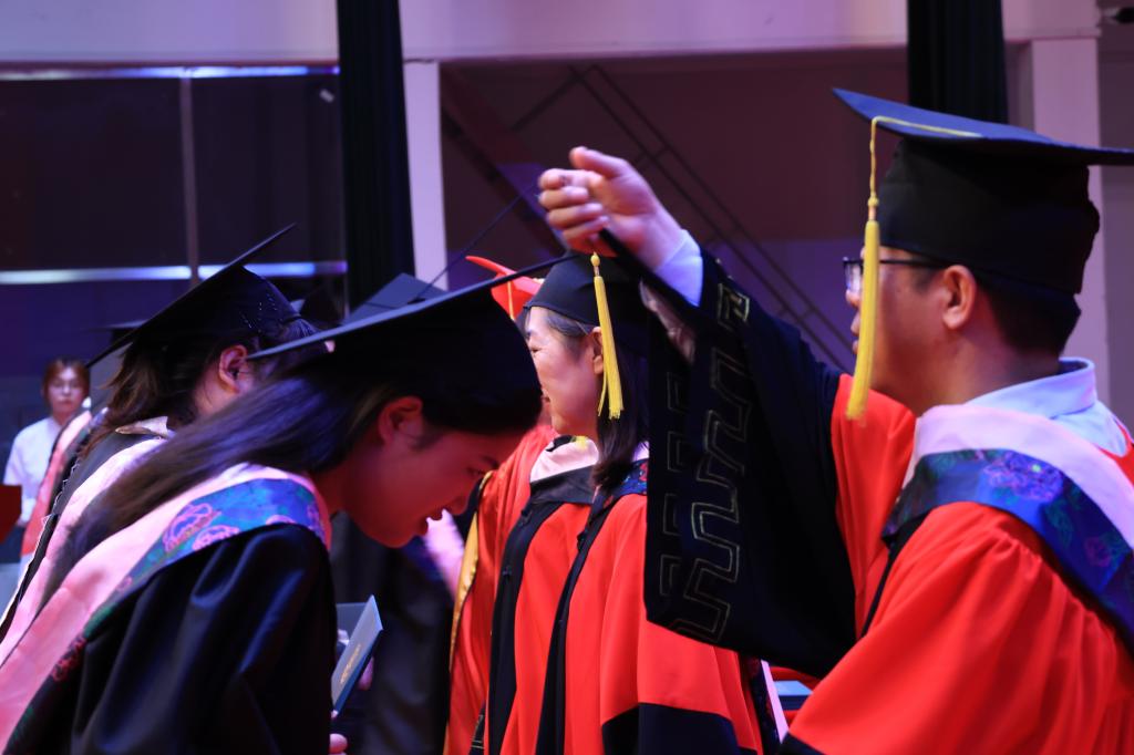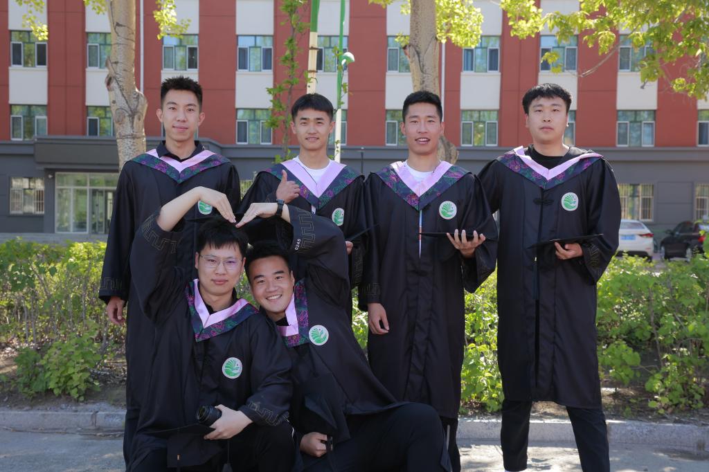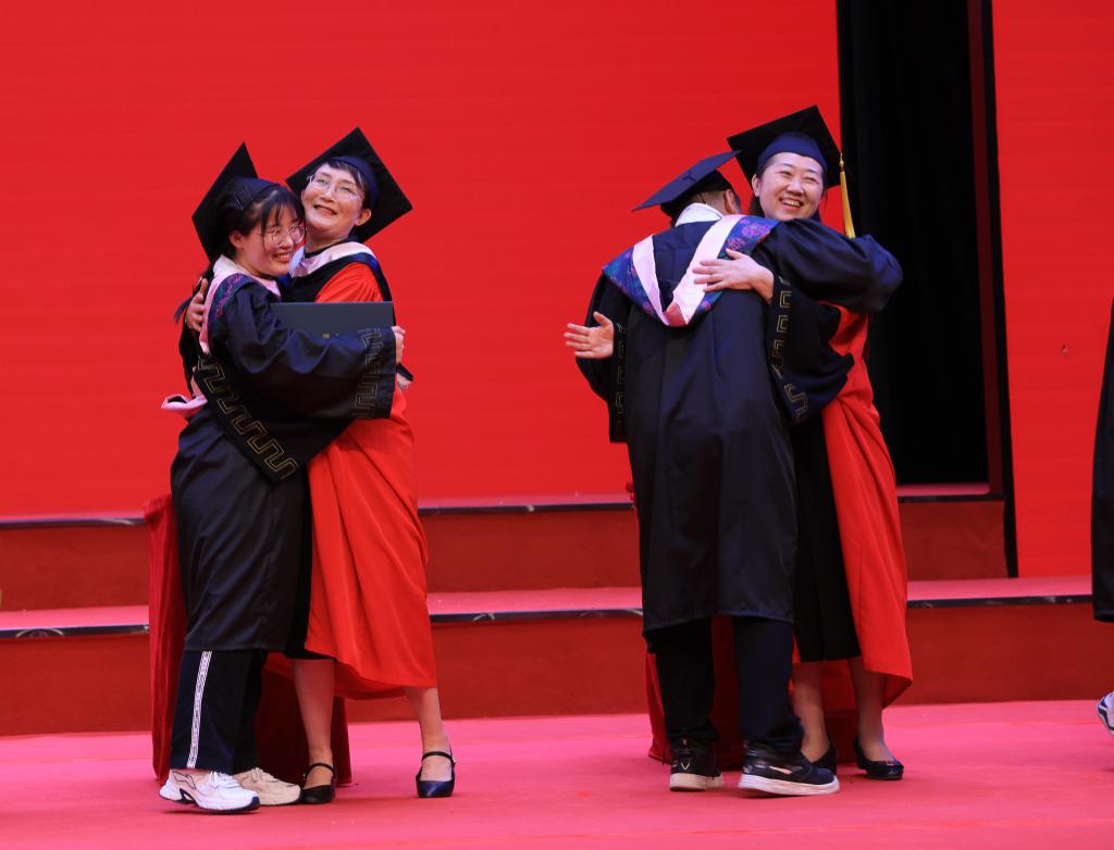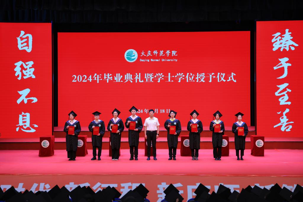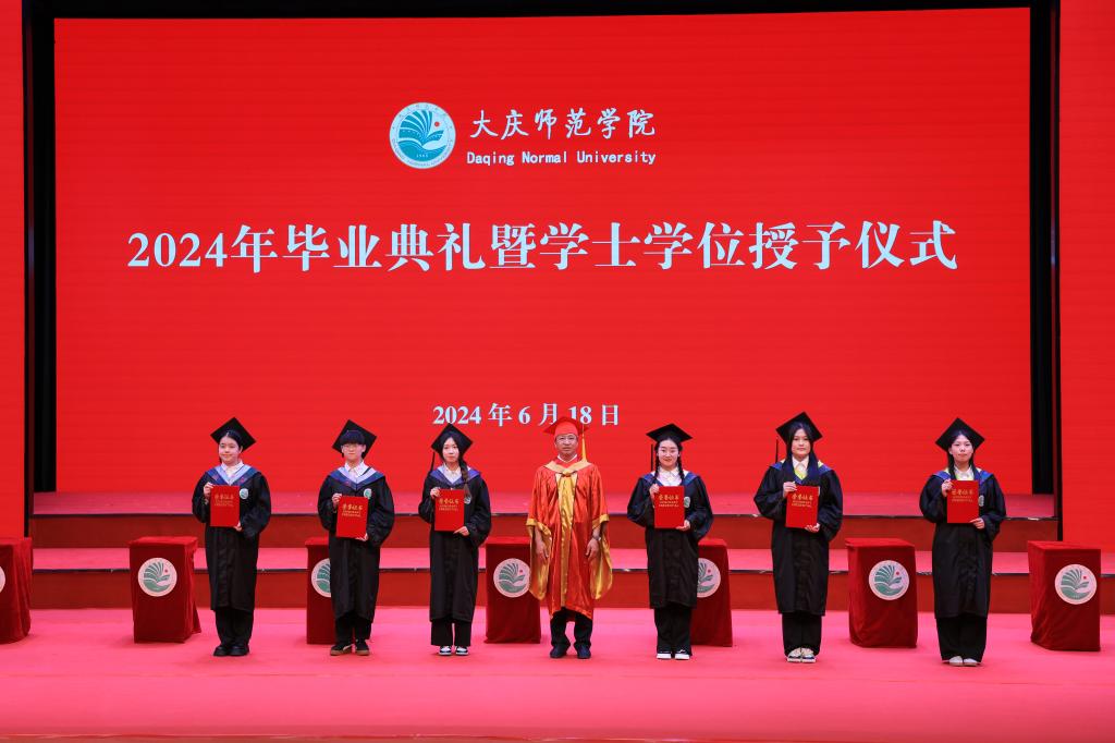 学校学位评定委员会全体成员为2024届毕业生代表授予学士学位证书,拨苏正冠,并与学生们合影留念。