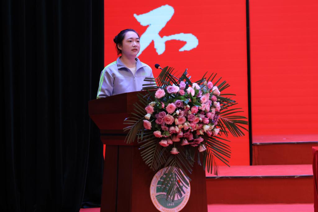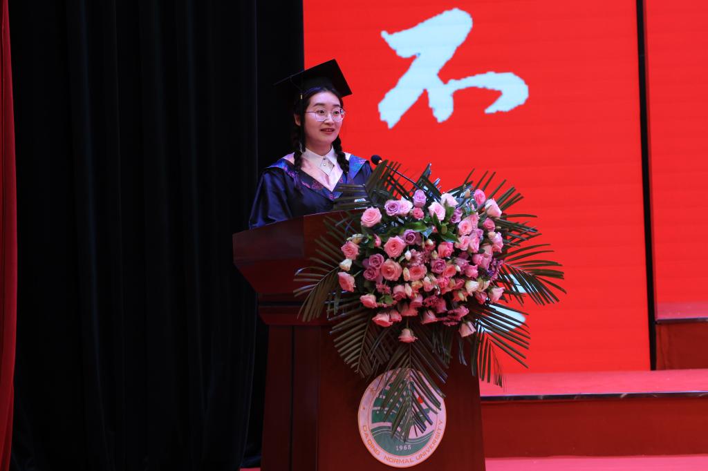 在校生代表,校团委学生副书记、文学院学生方立冬向即将毕业的学长学姐们送去了衷心的祝福,同时表示全体在校生会以毕业生们为榜样,刻苦钻研,勤于实践,勇于创新,与学长们一起肩负起为母校争光、为国家效力的重任。