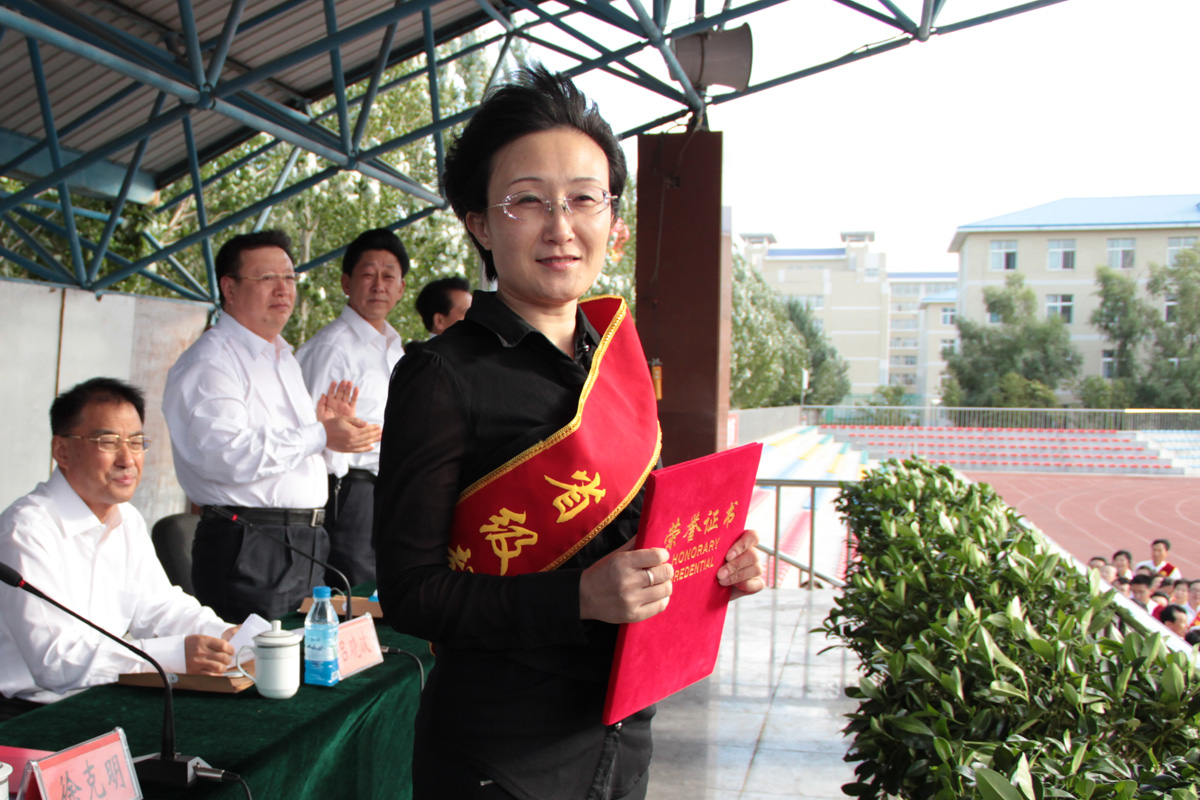 荣获省级教学名师、校级教学名师、校先进单位、校先进工作者身披绶带,胸戴红花在前排就座。