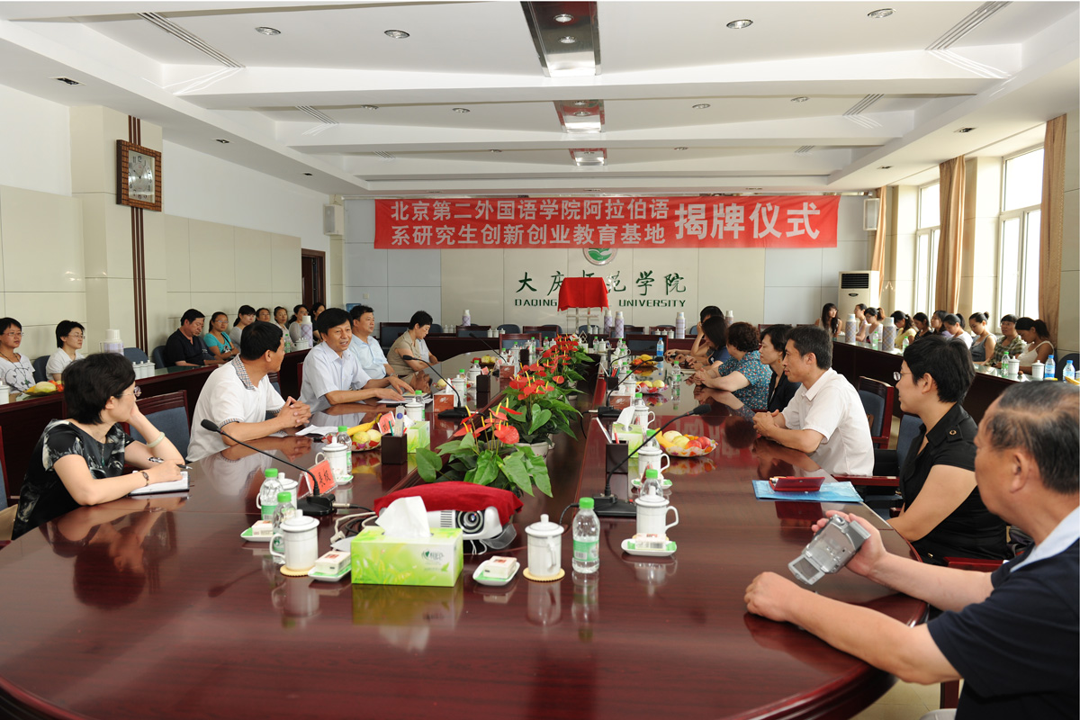 副校长杨锐锋对前来参加揭牌仪式的北京客人表示热烈欢迎,并介绍了我校的办学基本情况,北京第二外国语学院阿拉伯语系主任李宁感谢学校对阿拉伯语系研究生创新创业教育基地的支持,希望两校在今后更好地沟通与合作。
