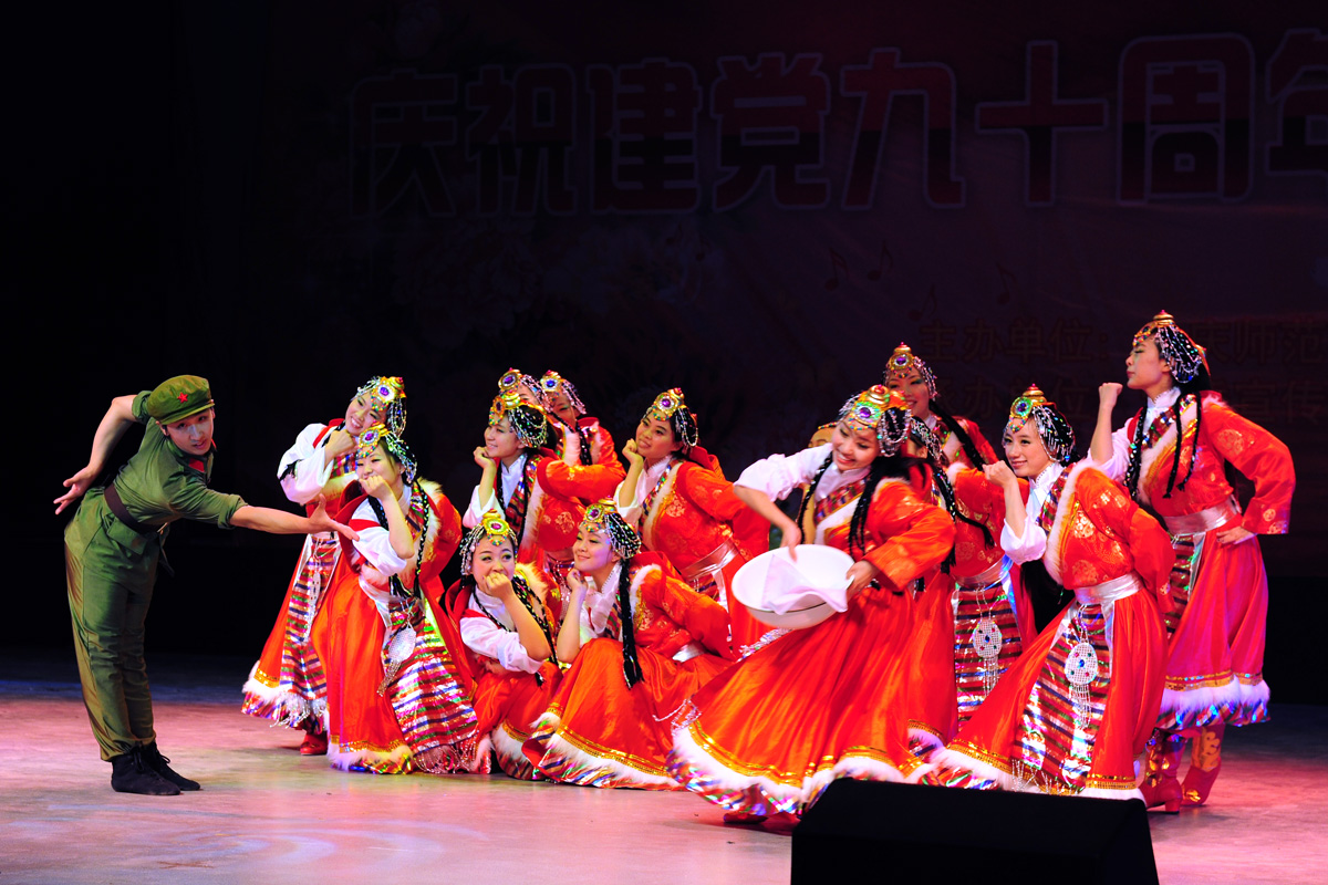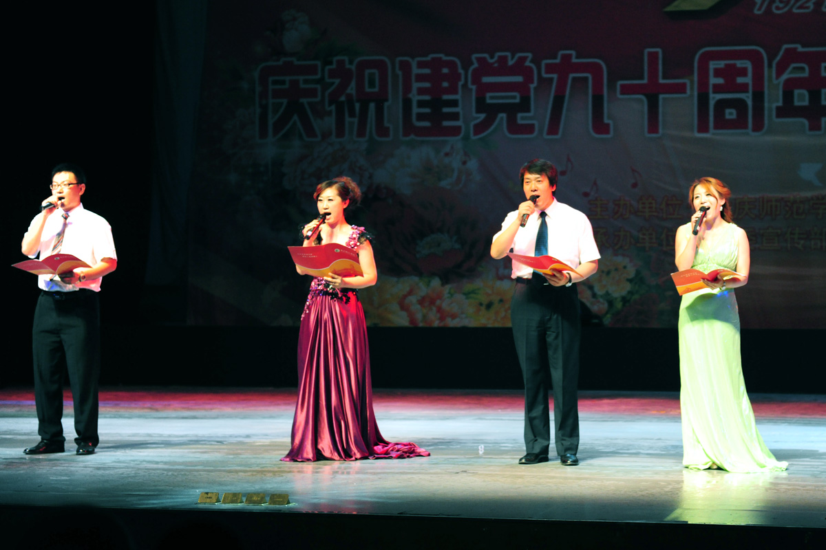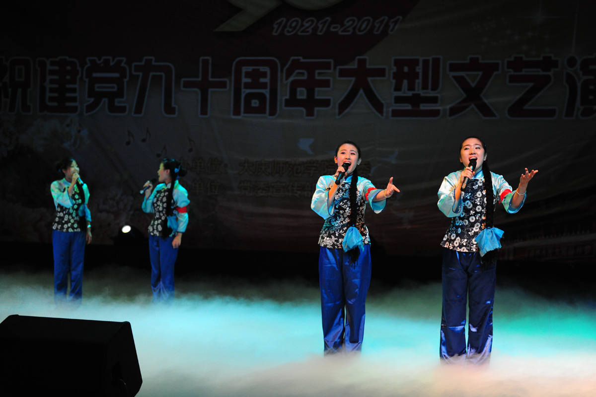 “唱支山歌给党听,我把党来比母亲……”伴随着悠扬动人的旋律,大合唱《唱支山歌给党听》、《在灿烂阳光下》拉开了演出序幕。舞蹈《洗衣歌》表现了革命战争年代军爱民,民拥军的鱼水深情;歌曲《报答》、《克尔克孜歌唱毛主席》、《旗帜更鲜艳》、《洪湖水浪打浪》、《我的深情为你守侯》唱出了当代青年对伟大的党,对伟大的祖国无限热爱和感恩之情;二胡齐奏《光明行》以明快坚定的旋律,歌颂了中国共产党的诞生给中华民族带来的希望和光明;笛子独奏《秦川情》描绘了中华民族的文明发祥地,八百里秦川的风土人情;绚丽多姿的民族舞蹈《勐巴拉娜西》带观众走进神奇的西双版纳;诗朗诵《在党的阳光下》用饱含深情的语言讴歌了党的丰功伟绩,表达了庆师人对党的无限热爱,掀起了全场师生的共鸣和热烈的掌声。