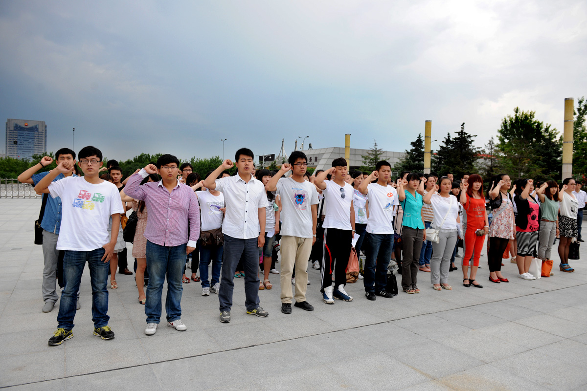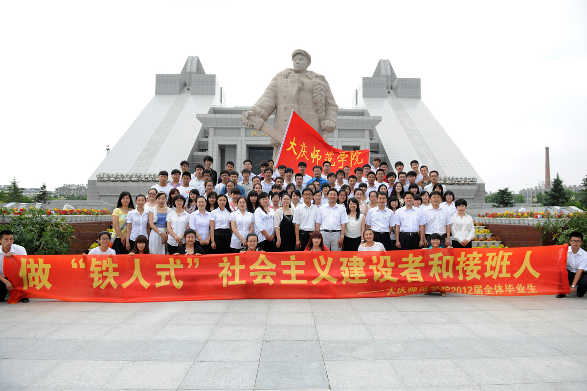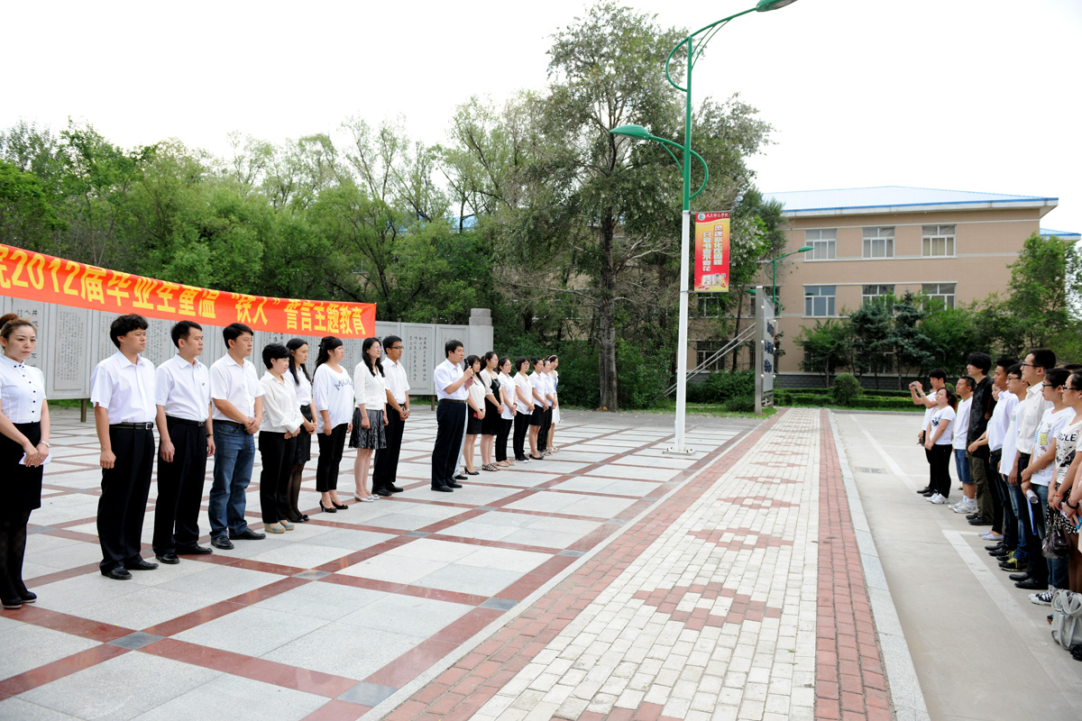 在铁人王进喜纪念馆铁人塑像前,毕业生代表高举右手,郑重宣誓:继承铁人遗志,弘扬铁人精神,求真务实,奋勇拼搏,报效祖国,服务人民,做“铁人式”社会主义建设者和接班人。