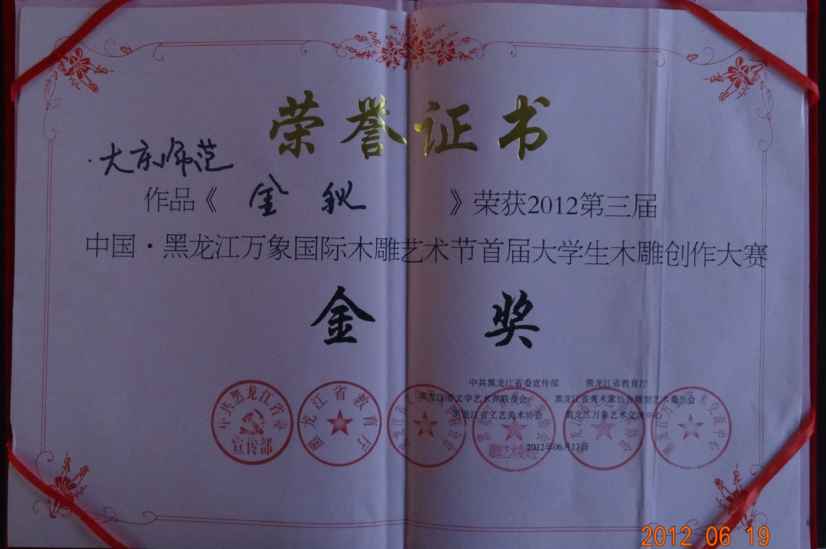 6月17日,由国家建设部城市雕塑建设指导委员会艺术委员会、中共黑龙江省委宣传部、黑龙江省教育厅和黑龙江省文联联合举办的“2012第三届中国•黑龙江万象国际木雕艺术节暨大学生木雕创作大赛”落下帷幕。受组委会邀请,艺术学院美术艺术设计系李方海老师带队,徐良、宋录奎两名同学组成的雕塑团队参加了比赛。在比赛中,指导教师制定方案、悉心指导,学生不畏强手、认真创作,最终在二十个参赛队伍中脱颖而出,一举夺冠。