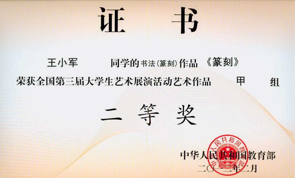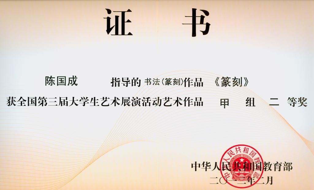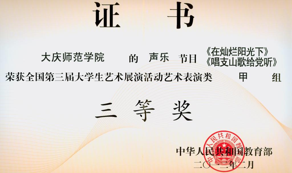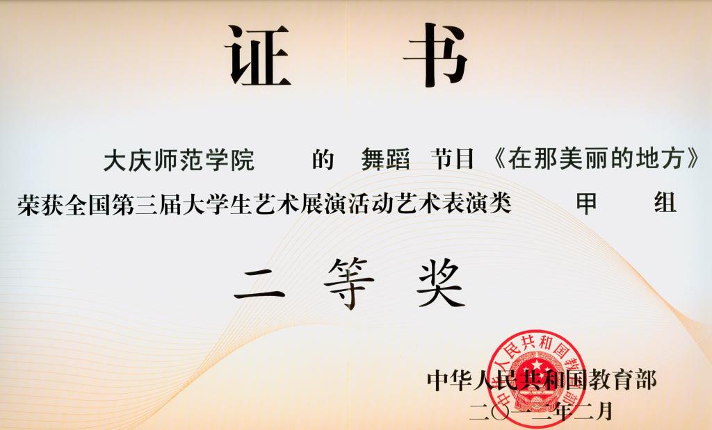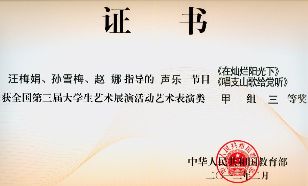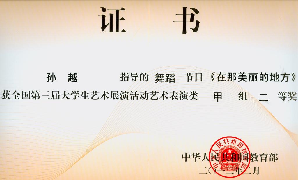 其中,舞蹈作品《在那美丽的地方》获艺术表演类甲组二等奖;声乐作品《在灿烂的阳光下》、《唱支山歌给党听》获表演类甲组三等奖;由孙越指导的舞蹈作品《在那美丽的地方》获表演类甲组二等奖;由汪梅娟、孙雪梅、赵娜指导的声乐作品《在灿烂的阳光下》、《唱支山歌给党听》获艺术表演类甲组三等奖;由陈国成指导的书法(篆刻)作品获艺术作品甲组二等奖;王小军同学的书法(篆刻)作品获艺术作品甲组二等奖。365英国上市官网获全国第三届大学生艺术展演活动优秀组织奖。