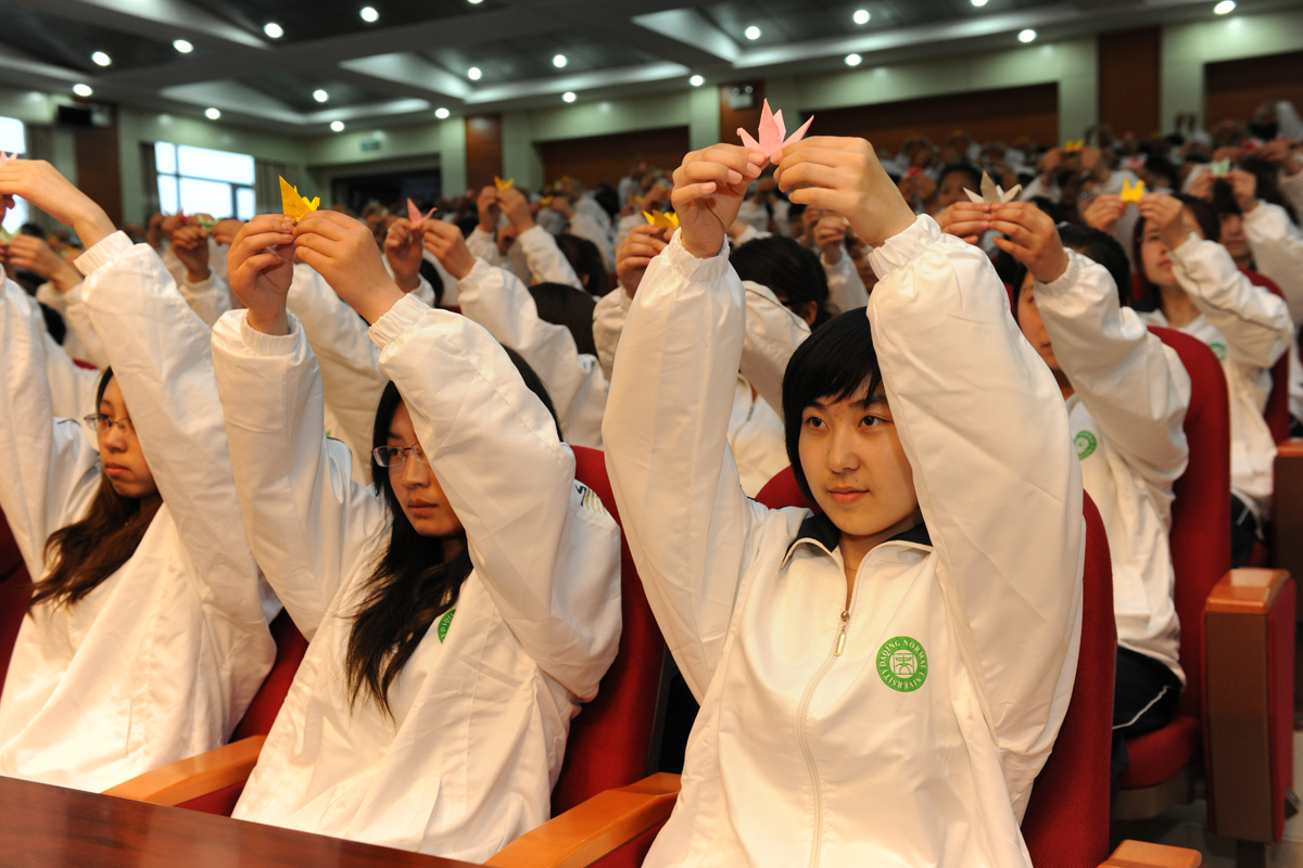 文学院李夺同学眼含热泪说:“对于学姐的壮举我们既心痛又感动,她为了自己的学生能以青春甚至生命的代价来完成自己的教师使命,这是她带给我们最大的震撼,我决心在将来的教师岗位上一定要像学姐那样,全心全意的去爱学生,把他们培养成对社会有用的人,希望我们的祝福随着小纸鹤飞到学姐的身边,陪伴她度过难关。”