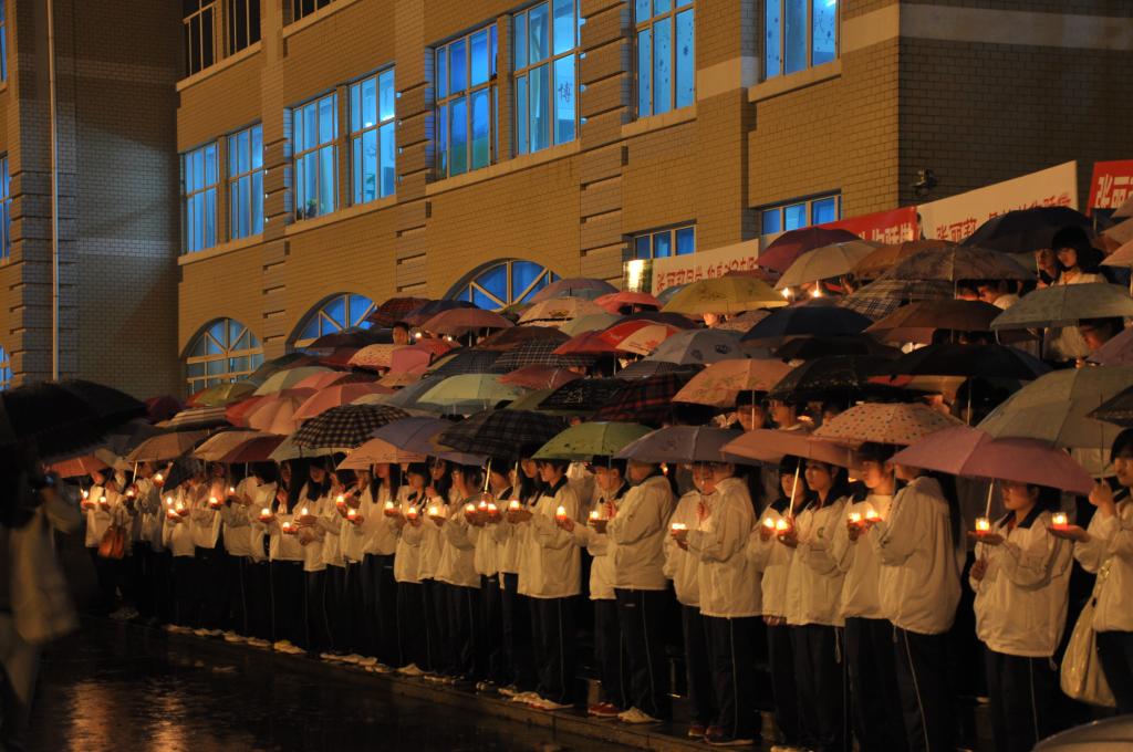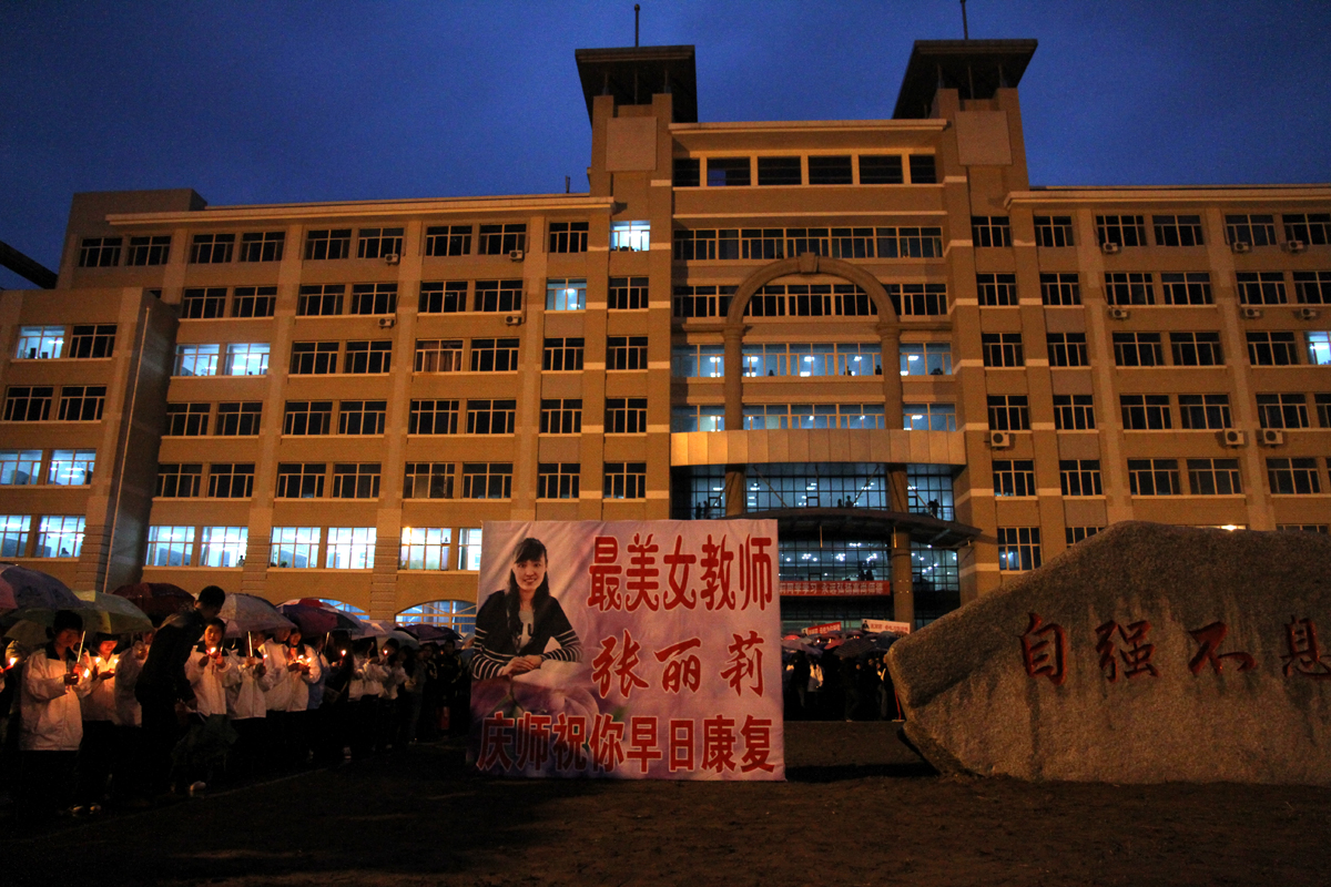 同学们手中的蜡烛在风雨中摇曳摆动。雨水打湿了校服,但人却越聚越多。“她是咱们学校07届的师姐,现在还在医院抢救。”两位同学低声的说。“二十九岁的张丽莉老师,正值花样年华,在生死关头却毫不犹豫地推开危难在即的学生,自己被碾压在无情的车轮之下,双腿高位截肢,至今仍没有苏醒。”学生工作处张芮荧老师的话让很多学生双眼湿润。