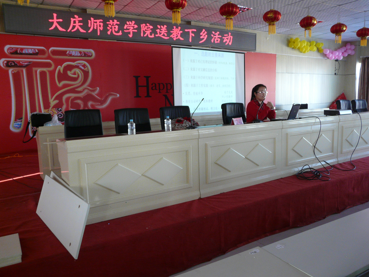 活动中,“黑龙江省西部地区基础教育研究与教师培训中心”办公室主任李士明、外国语学院教师王宏伟、教育科学学院教师李黎波、谢巍分别从教师心理健康、有效教学、英语语法、教育科研方法等四方面为与会教师作了精彩讲座。肇州县教育局领导、教师进修学校教研员、中小学业务校长、中小学教导主任、全体教师2000余人聆听了精彩报告。