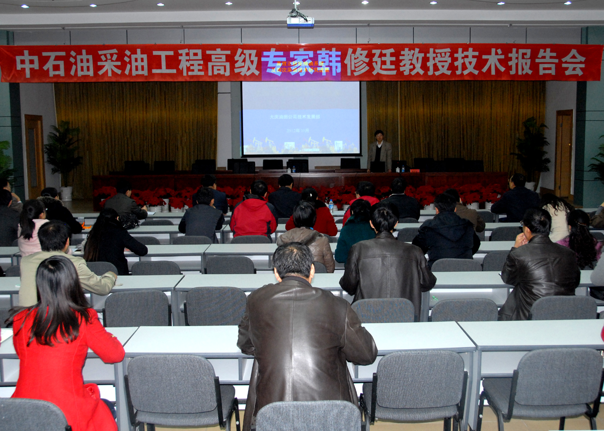 10月24日,中石油采油工程高级专家、大庆油田有限责任公司技术发展部主任韩修廷教授应邀为我校教师做了题为《大庆油田科技发展历程》、《高效正扭矩抽油系统及四次采油技术研究进展》的学术报告。副校长杨锐锋,化学化工、物理与电气信息工程等理工科学院的领导和教师聆听了精彩的学术报告。