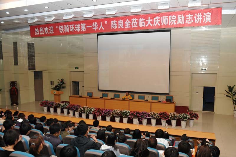 10月11日晚, 由大庆旅游局组织的“铁骑环球第一华人”的陈良全先生励志演讲会在我校百湖大讲堂举行。市旅游局领导及经济管理学院等800余名学生聆听了演讲。