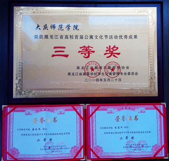 5月20日下午,黑龙江省高校学生公寓文化建设成果展示交流会暨全省学生用纤维制品质量工作会议在哈尔滨师范大学召开。会议回顾总结了2013年全省高校学生公寓文化建设宣传工作落实情况,安排部署2014年工作,同时表彰了39所高校学生公寓和56名论文获奖先进个人。其中,我校公寓荣获黑龙江省高校首届公寓文化节活动优秀成果三等奖,廉世伟、张慧泽老师分别荣获黑龙江省高校学生公寓文化建设优秀论文评选二等奖。