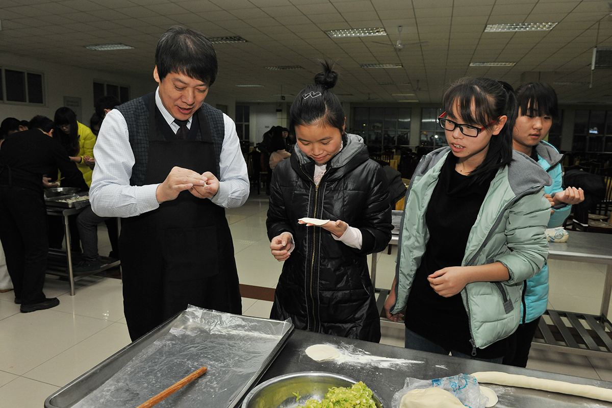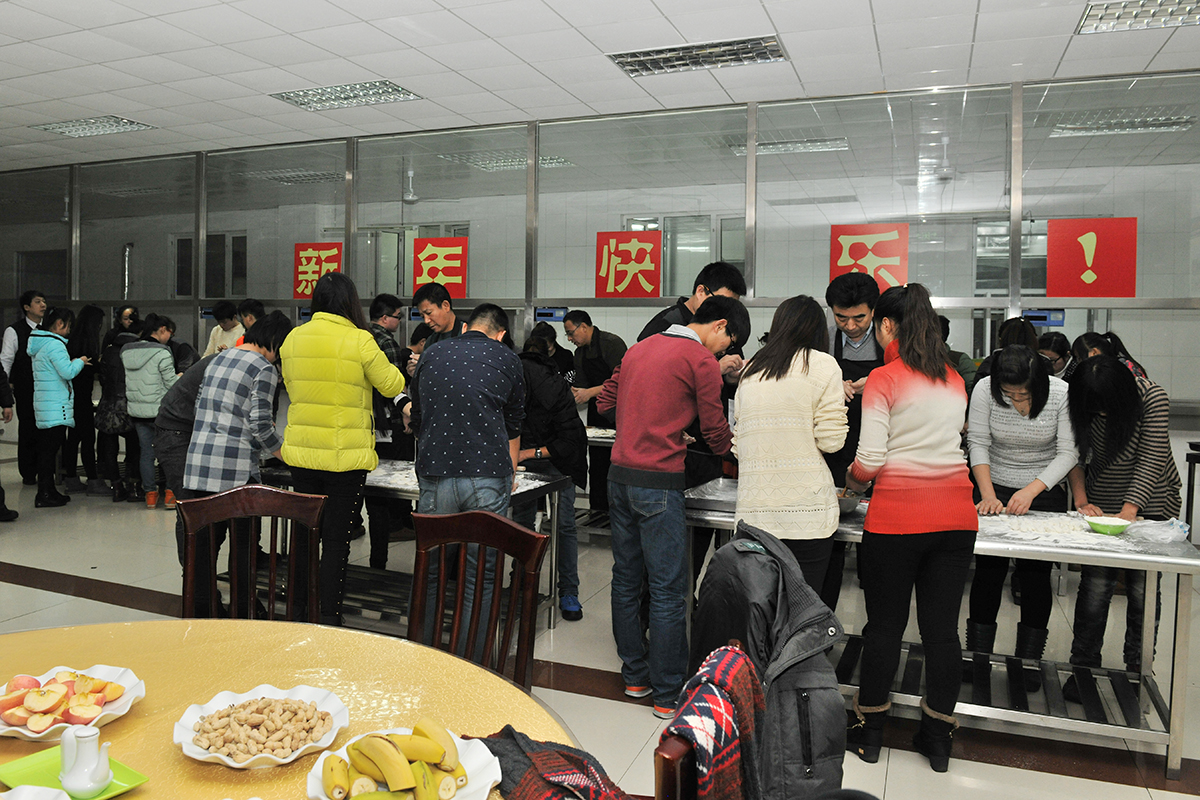 食堂工作人员为大家准备好了包饺子的材料和用具,大家撸起衣袖,洗净手,揉面、擀皮、包饺子。大家一边包饺子一边交流着各自家乡新年的习俗,互相比赛看谁包的好看,谁包的馅多,调皮的同学还包出了异性饺子,引发阵阵笑声。当热气腾腾的饺子端上来时,食堂里欢呼声一片,品尝着美食,分享着快乐。