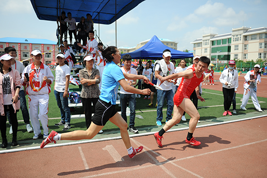 在传统径赛田赛赛场,同学们奋勇争先,敢拼敢赢,充分体现了“更高、更快、更强”的奥林匹克精神。在学生集体项目“大河起舞”、“集体打搬运”中,同学们团队意识强烈,配合融洽,斗智斗勇,使运动会既竞争激烈又充满趣味。
