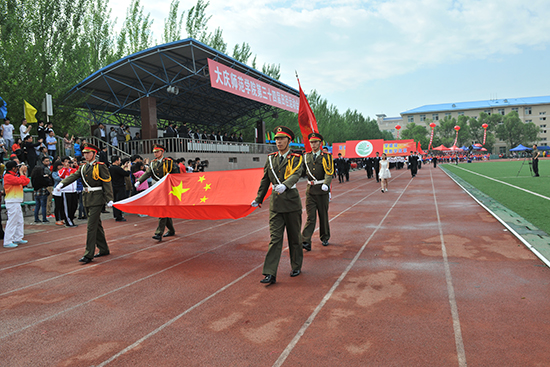在激昂雄壮的进行曲中,庄严的五星红旗在四名大学生护卫下走在检阅队伍最前方,“紧紧围绕应用技术型大学建设全面深化教育教学改革”、“提高全校师生身体素质为建设应用技术型大学保驾护航”标语牌异常醒目,刀旗队、花束队朝气蓬勃的通过主席台,12个院系,机关、教辅各部门的运动员代表迈着矫健的步伐、喊着响亮的口号,精神抖擞,意气风发的接受学校的检阅。