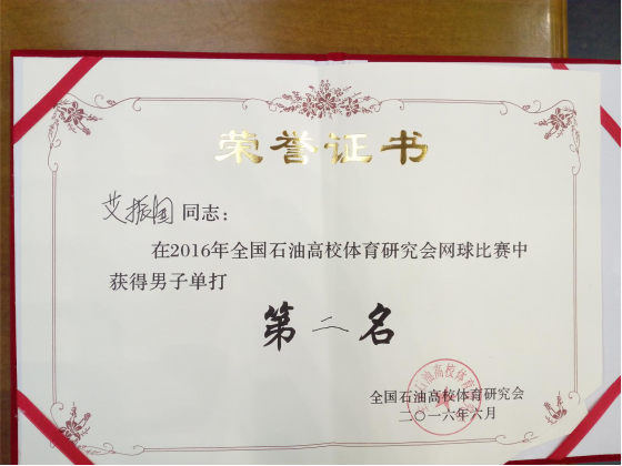 6月17-19日,2016年全国石油高校体育研究会网球比赛在美丽的山城重庆科技学院举行,我校体育学院教师艾振国、于力参加了本次比赛。比赛中,艾振国老师勇夺男子单打亚军,艾振国和于力老师搭档在男子双打比赛中获得第八名,365英国上市官网获团体总分二等奖。