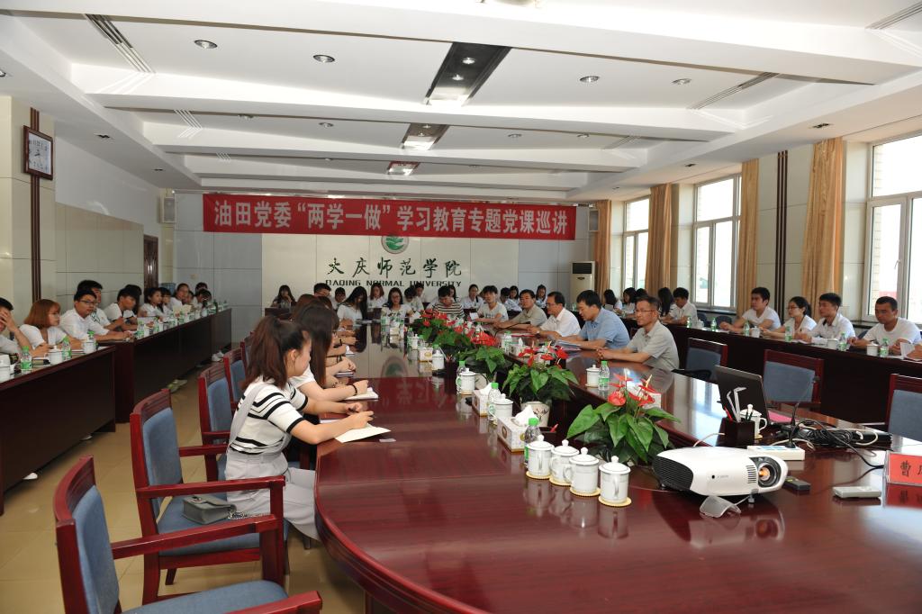 6月14日上午,油田党委“两学一做”专题党课第五巡讲组成员,试油试采分公司试采大队党委书记曹凤成同志,装备制造集团力神泵业公司纪委副书记、纪检监察部主任高华强同志,采油七厂稳定协调服务中心副主任王丛福同志,采油六厂第二油矿204队党支部书记赵柱同志一行四人,来到我校进行党课巡讲。各二级学院学生党员代表60余人参加此次党课。党课由学校党委委员、组织部部长徐晓东同志主持。