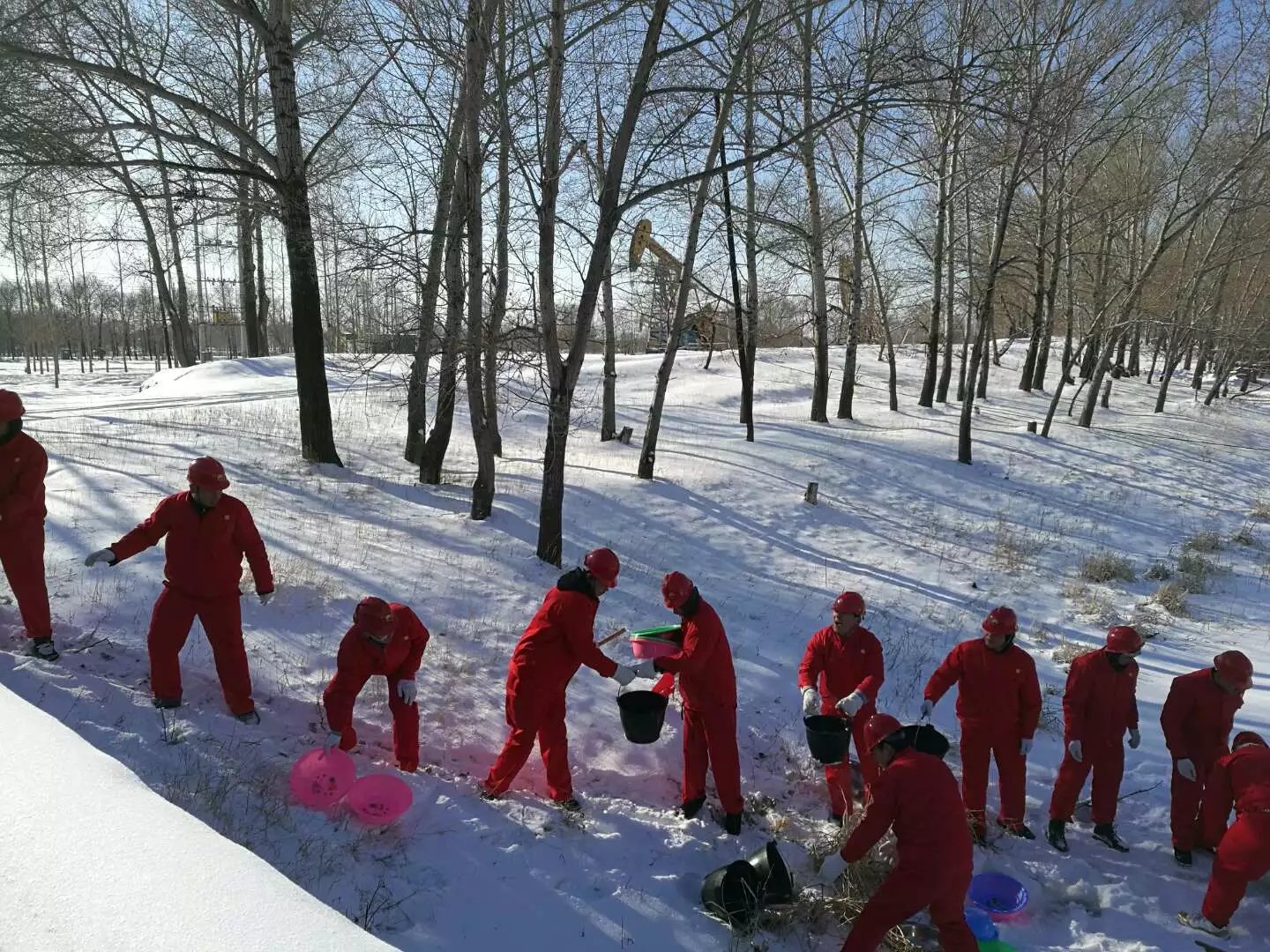 为了更好体验当年会战的艰辛,基地组织同学们进行了“破冰端水保开钻”体验式教学。在体育学院国家级拓展训练师、大庆精神社会实践研修基地李晓全老师的带领下,组建团队进行了凿冰取水比赛。两队由岸边到冰面排成一列长队,前面的同学负责凿冰取水,后面的同学则依次向后传递,虽然天气很冷,大家都在紧张有序地参与着,很多同学的手脚已经已经冻麻了,溢出的水在手套上也结上了冰碴,但没有人停下来。大家喊着号子,互相鼓劲加油。文学院覃艳秋同学深有感触地说“通过这个活动,我更加体会到了铁人们当时工作的艰难。那时的温度比现在低很多,条件也比现在恶劣很多,可铁人们就是在那样的条件下靠人拉肩扛,凿冰取水保证了钻井工作的正常进行。这样的困难,他们都能克服,与他们相比,我们眼前的困难又算得了什么呢?”
