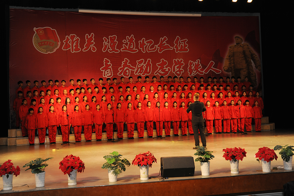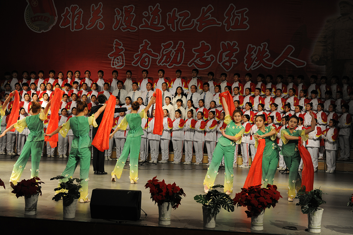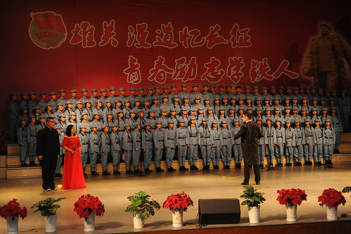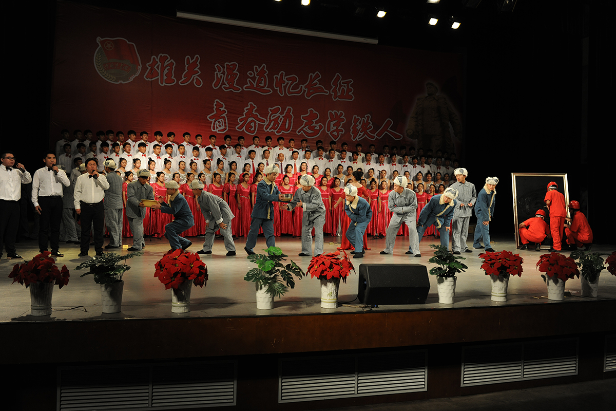 外国语学院的全体演员身着红军服装,激情演唱了《四渡赤水出奇兵》《踏着铁人脚步走》,震撼了全场观众。