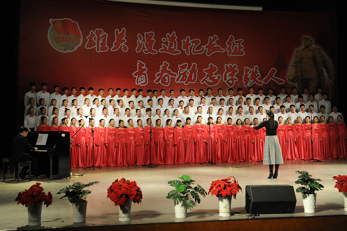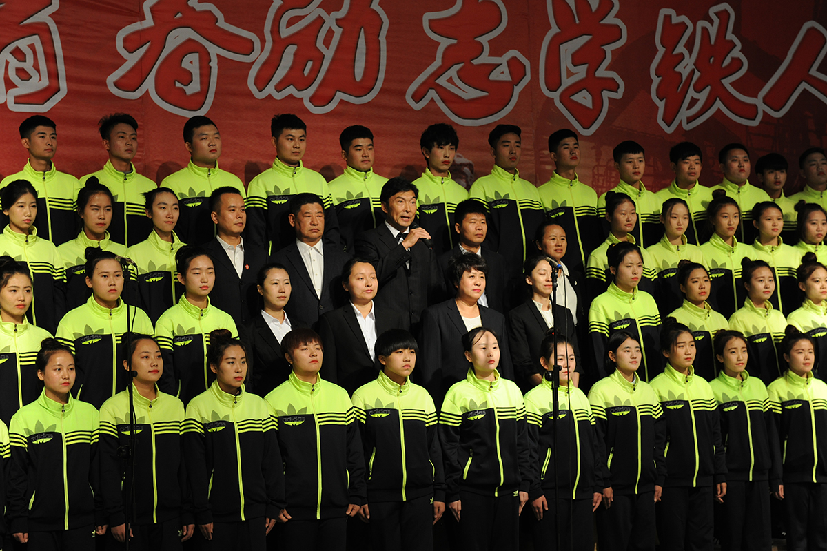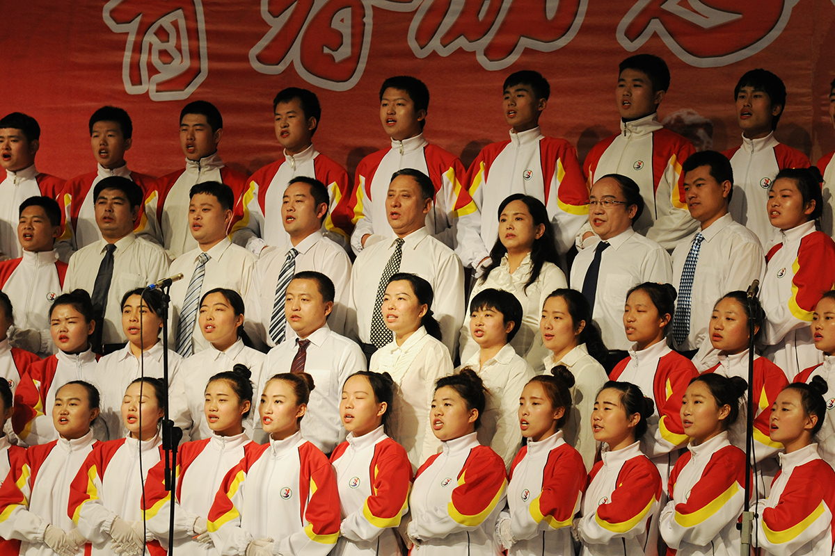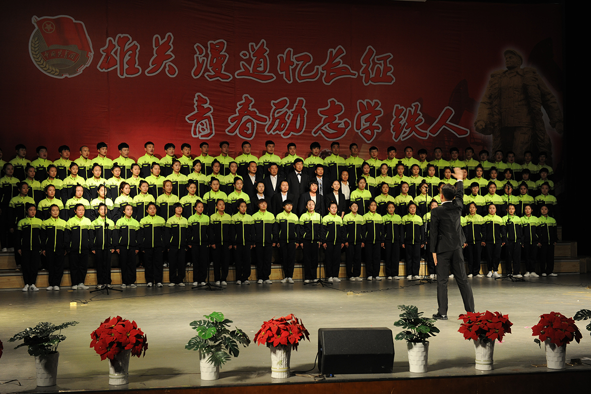 体育学院全体合唱演员士气高昂、用嘹亮的歌喉倾情演唱了《红军不怕远征难》《踏着铁人脚步走》。