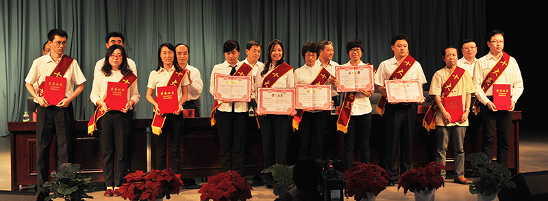 在悠扬的进行曲中,校领导分别为先进单位、先进工作者、十大亮点单位代表颁发奖牌和证书。