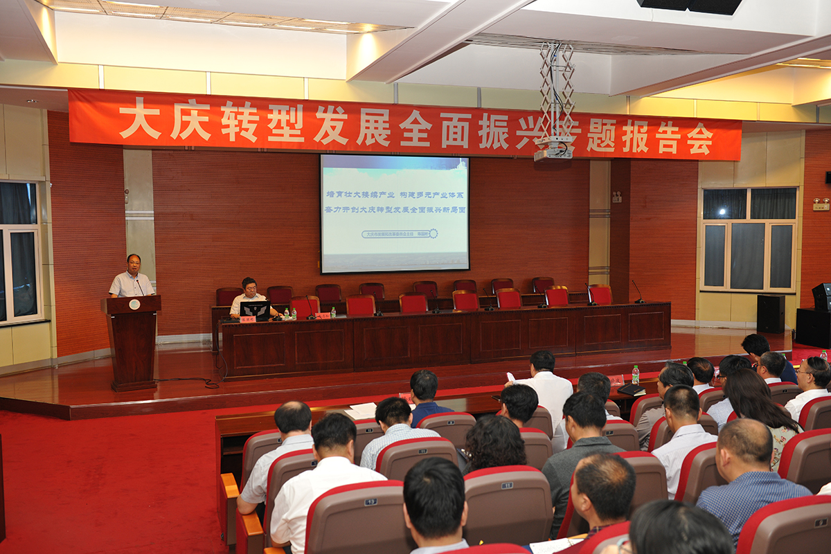 会上,陈主任从大庆产业结构、城市发展现状、以及近两年国际油价下跌、原油产量下降对大庆经济社会发展带来的困难与挑战,用详实的数据从推进转型发展的成效、经济发展的阶段性特征、地企合作促进大庆产业转型发展、加快构建多元产业体系等四个方面阐述了大庆新一届市委市政府积极应对、迎接挑战、调整产业结构等一系列举措和取得的成绩。