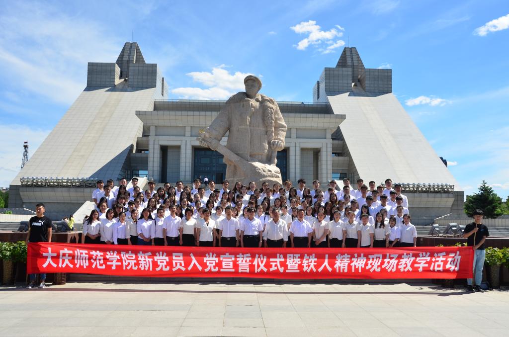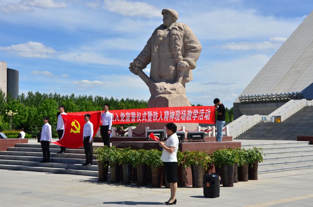 在铁人雕像前,125名新党员面对党旗,紧握右拳,向党庄严宣誓,一句句铿锵的誓言在铁人纪念馆上空回荡。
