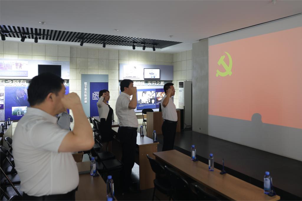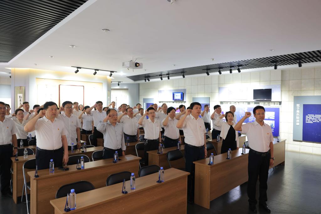 校长张平带领全体处级干部,面对鲜红的党旗,庄严地举起右手,重温入党誓词,紧握的拳头坚定有力,铿锵的誓词整齐划一,铮铮誓言响彻场馆,彰显了对党忠诚、为共产主义奋斗终身的决心。