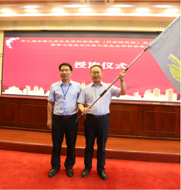 苍晶在闭幕式上宣布了下一届竞赛承办单位,任国领代表学校向李杰交接赛旗。