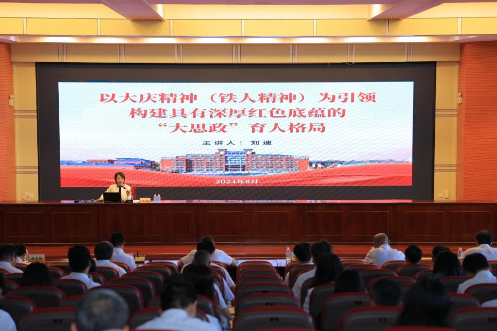学校党委副书记刘迪作了题为《以大庆精神(铁人精神)为引领构建具有深厚红色底蕴的“大思政”育人格局》的报告。报告从对构建“大思政”育人格局必要性的再认识、现实基础、思路与举措、分管工作的相关落实举措四个方面,结合自身的工作经验与思考进行细致阐述,为学校加快构建“大思政”工作格局明确了新思路、提出了新要求。