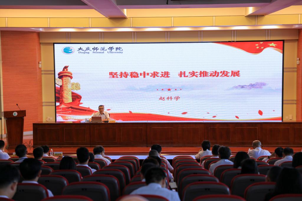 学校党委书记赵科学作了题为《坚持稳中求进扎实推动发展》的报告,报告紧扣学校改革发展和干部队伍实际,在认真研判学校发展现状、办学定位,以及存在的有利与不利条件的基础上,从解放思想、稳中求进、知行合一三个方面,对学校中层干部加强提升能力作风提出希望和要求。他强调,要深入学习贯彻党的二十届三中全会精神,坚持党对学校的全面领导,扎实落实立德树人根本任务,坚持以学科建设为龙头,在发展中保障和改善民生,推动学校各项事业上层次、上水平。他要求,学校领导干部要坚决把纪律规矩挺在前面,树牢机遇意识、市场意识、创新意识、服务意识,不断改进工作方法,稳住学校基本盘,深化改革、重点突破,积小胜为大胜,加快推进高质量发展。