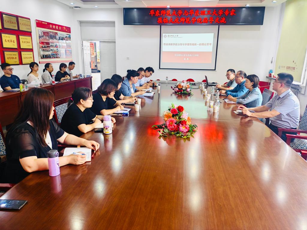 为持续深入学习贯彻习近平总书记在学校思政课教师座谈会上的重要讲话精神,扎实有效推进我校思政课教学与科研工作,着力培养担当民族复兴大任的时代新人,8月29日,我校邀请华东师范大学马克思主义学院副院长赵勇教授、华东理工大学马克思主义学院副院长徐国民教授、华东师范大学马克思主义学院张宗禧老师来校指导交流。校党委副书记刘迪、马克思主义学院领导班子成员、部分教师代表参加了交流会,会议由马克思主义学院负责人马吉芬教授主持。